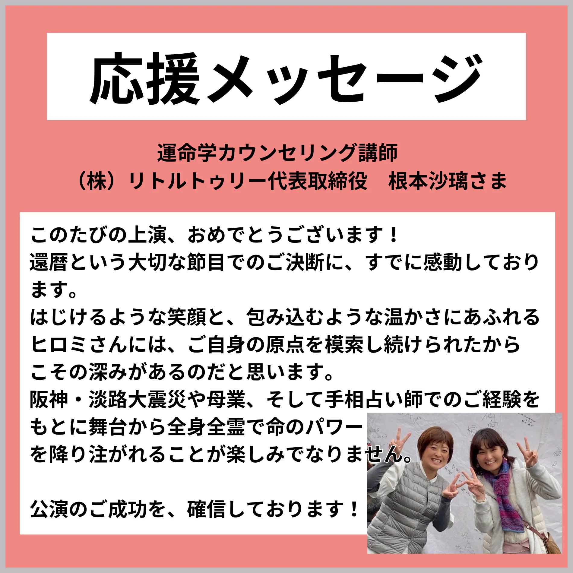 あなたの夢や希望を「夢を叶えた國本ヒロミ」が舞台上で叫び、観客の皆様から「おめでとう!」を大合唱していただきます。きっとあなたの夢、叶いますよ。
