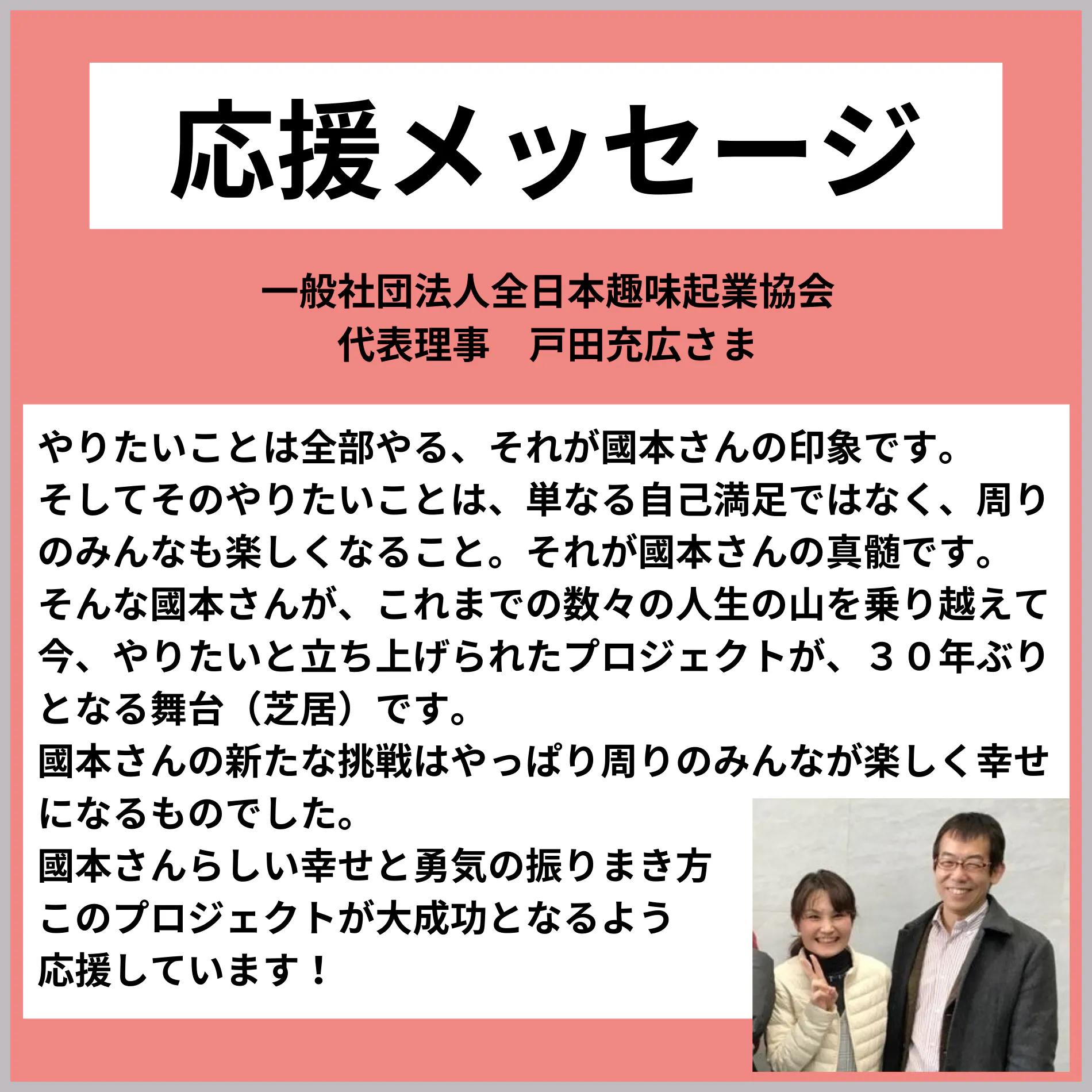 会場には足を運べないけど「応援してるよ!」または「特に大きなリターンはいらないけど応援しているよ」と言ってくださるあなたのために。國本ヒロミからのお礼の動画+パンフレットにお名前(ニックネーム可能)を掲載します。