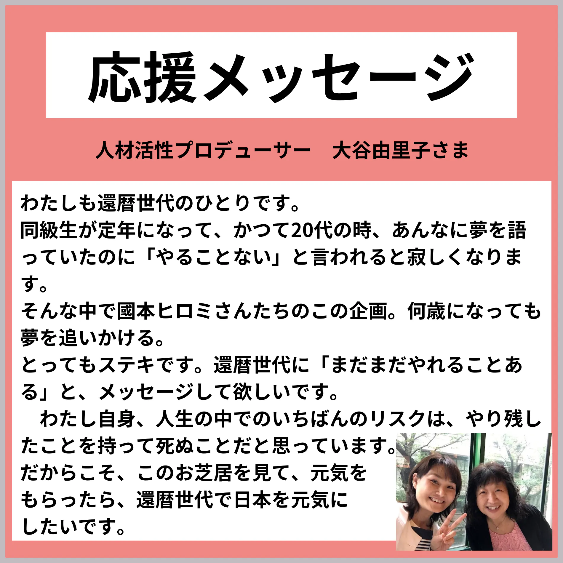 そんな私が、若い頃夢中になっていた「お芝居をもう一度やりたい!」と30年ぶりに、舞台に立つことを決意しました。