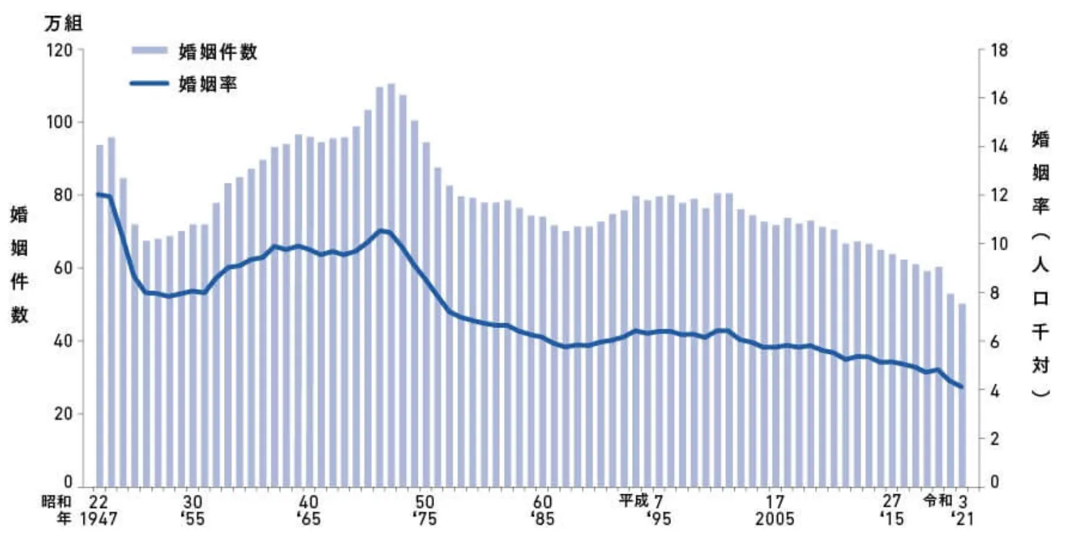 しかし、実際の結婚率は2021(令和3)年に報告された厚生労働省のデータによると、