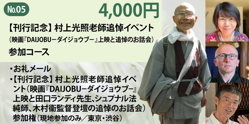 映画『DAIJOBU―ダイジョウブ―』(監督:木村衞、2023年)は今年の夏に公開され話題となりました。老師の最晩年の7年を追ったドキュメンタリーです。そして追悼のお話会にご登壇いただくのは、『サンガジャパンプラスVol.3』に収録する村上光照老師追悼特集にもご寄稿をいただいている、3人の先生方です。