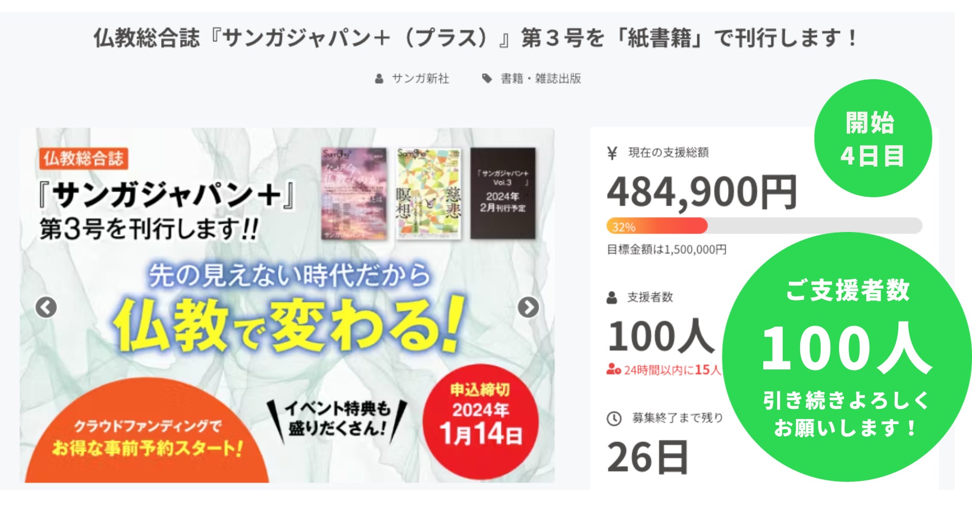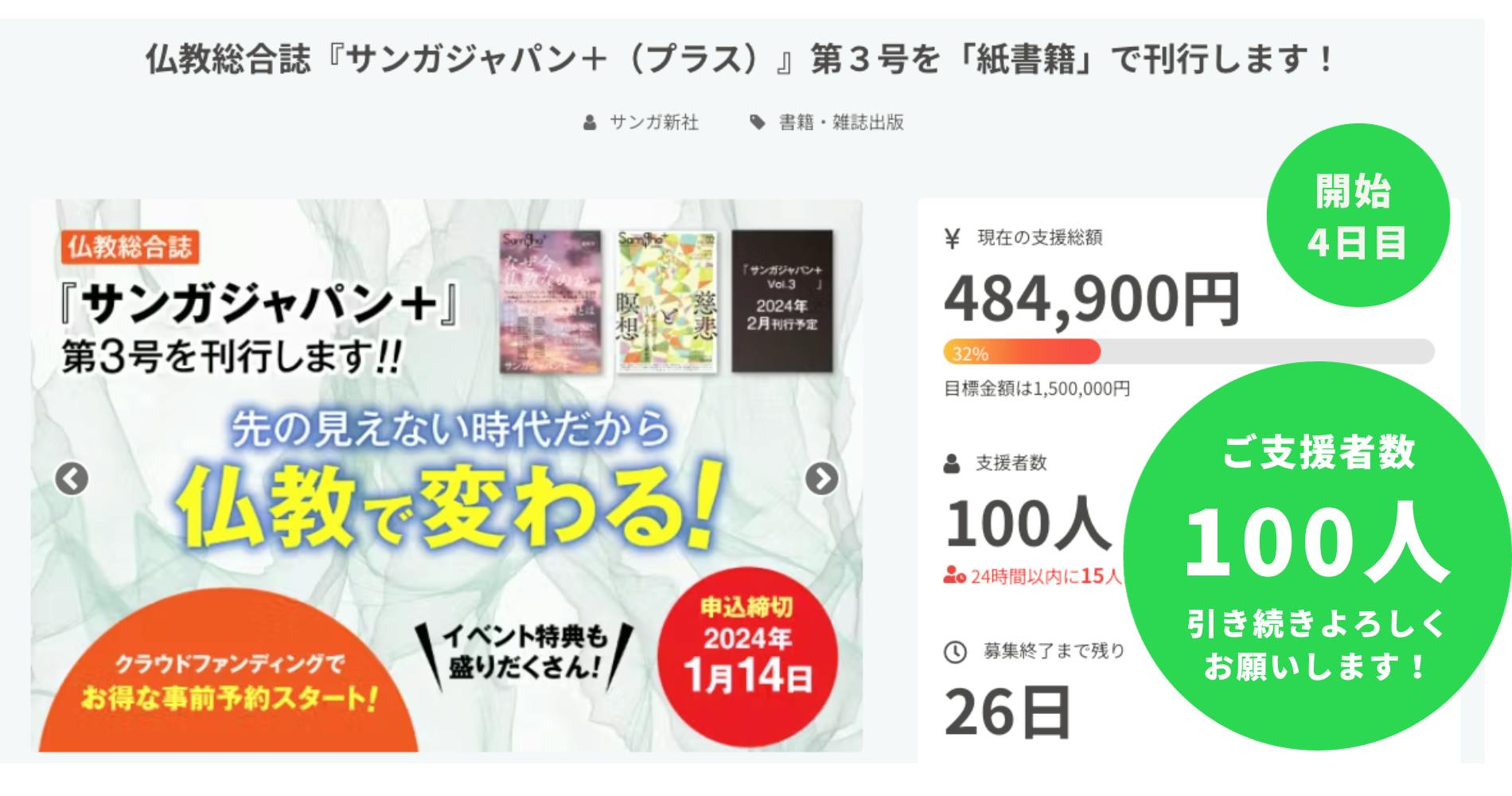 「仏教総合誌『サンガジャパン+(プラス)』第3号を「紙書籍」で刊行します!」クラウドファンディングは、12月19日(火)に4日目を迎えました。