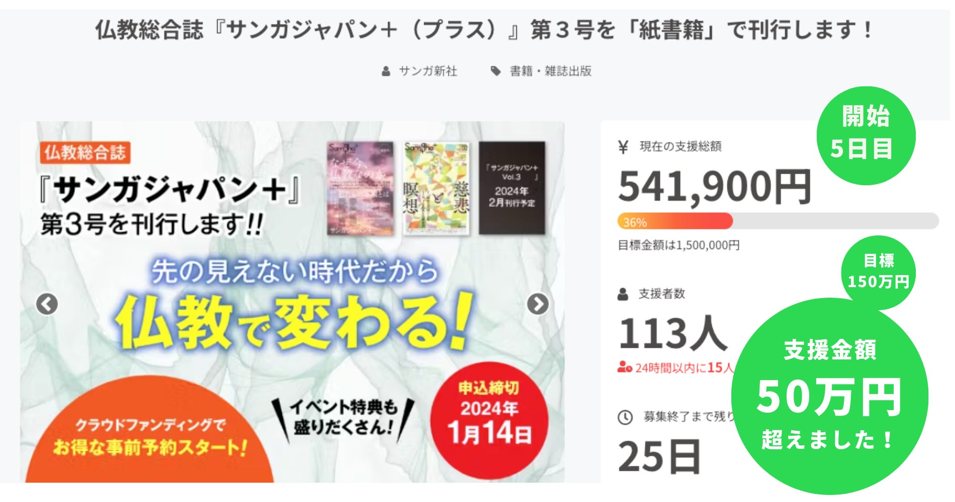 これまでの『サンガジャパン+』のクラウドファンディングを上回るペースで、第3号のプロジェクトを展開させていただいております。みなさんの暖かなご支援に深くお礼申し上げます!