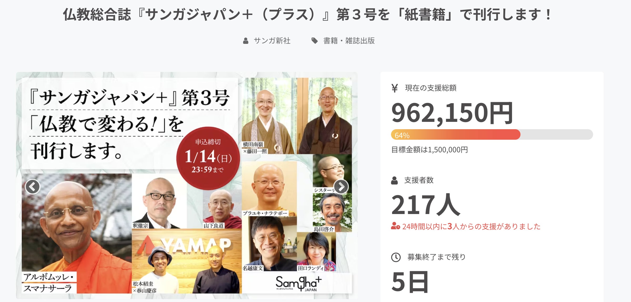 2024年2月に刊行する仏教総合誌『サンガジャパン+ Vol.3』は、1月14日(日)までクラウドファンディングで事前予約を受け付けています。