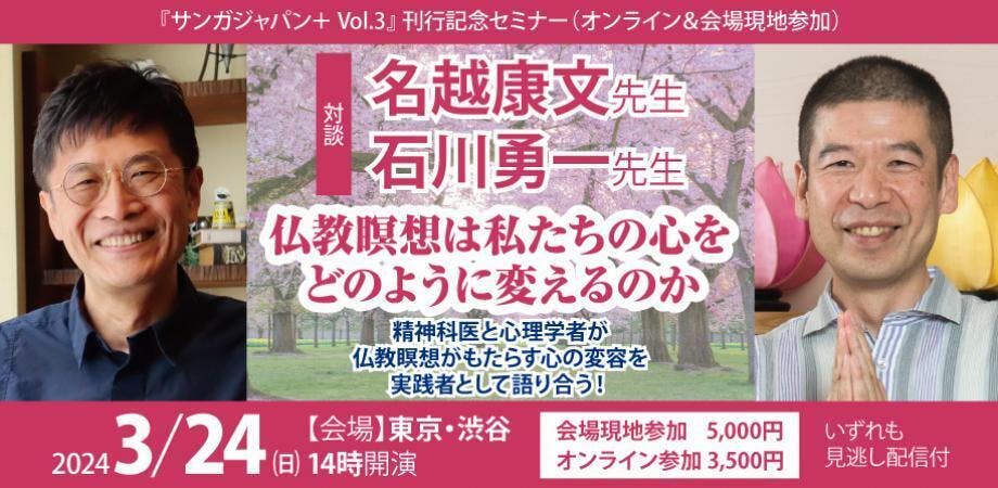 3月24日(日)に「仏教瞑想が私たちの心をどのように変えるのか」をテーマに、精神科医の名越康文先生と、心理学者の石川勇一先生にご対談をいただきます。