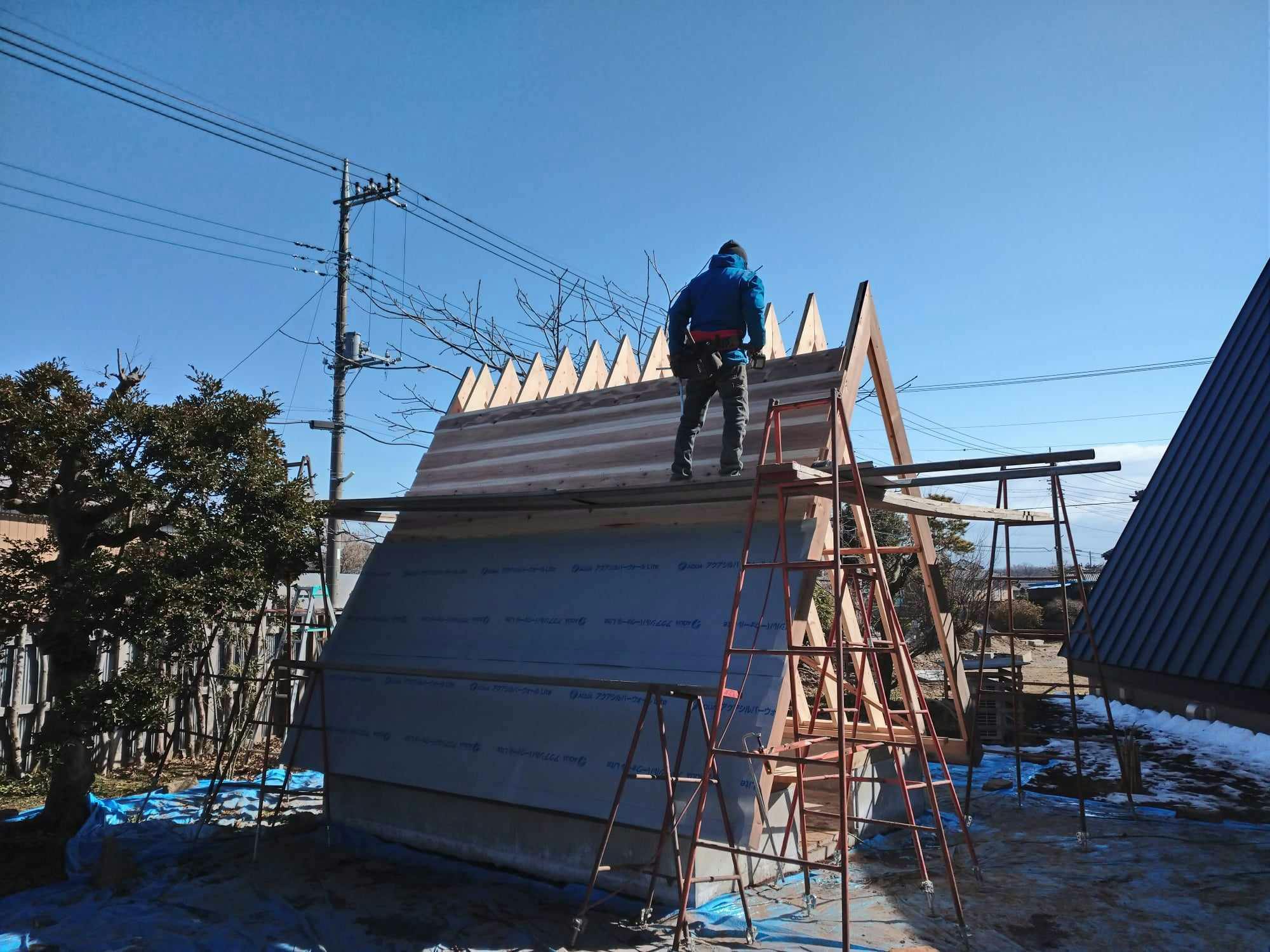 昨日上棟し、今日から屋根づくりが始まりました。