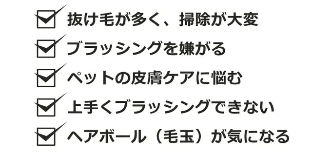 A:ブラッシングは、毛がたくさん取れれば良いというわけではなく、本来抜け毛や抜けかかった毛を取り除くものです。また、先のとがったブラシを使用した場合、必要な毛や角質まで取り除かれることがあります。