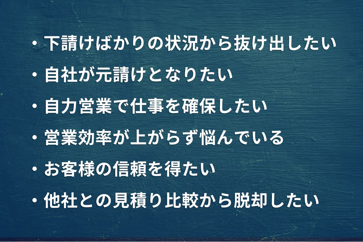 建築・リフォーム業界では、営業力がないために下請けに甘んじてしまう企業や個人事業者、一級品の腕を持ちながらコミュニケーションが苦手な職人さんたちがたくさんいます。業界の約9割が下請け、といわれるのがこの業界の実態です。