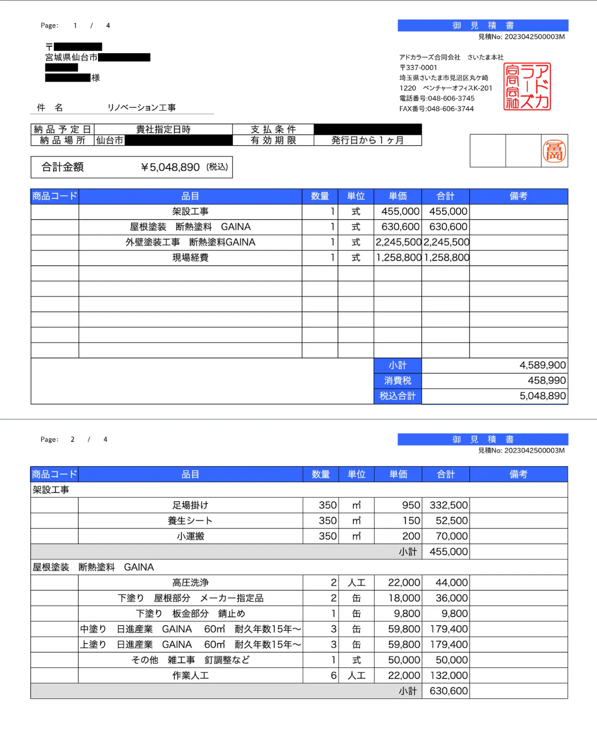 ひとつは、「原価を隠さない見積書」による工事内容と費用の提示。