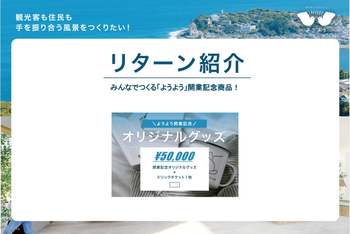 ご支援へのリターンとして「オリジナルグッズ」をお選びいただいた場合、「ようよう」開業記念商品に限定シリアルナンバーを入れてご提供いたします!加えて「ようよう」にお越しくださった方にはドリンクもご提供いたしますので、新しくなった「ようよう」で一息つきながら、愛着を持っていただけると嬉しいなと思っています!
