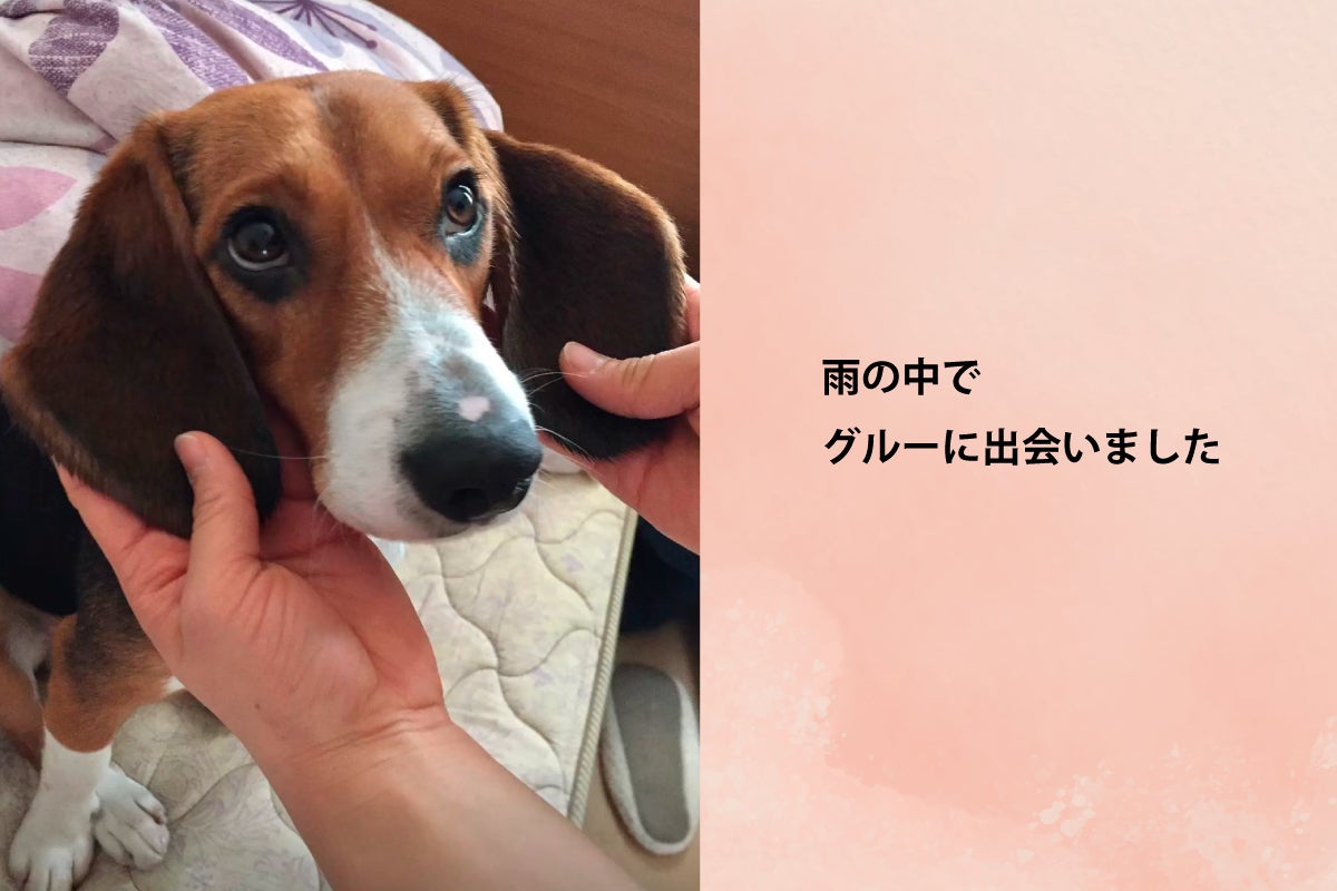 大学院生だったある雨の日、いつもは自転車で帰っていたのですが、その日は傘をさして歩いてアパートに帰っていました。すると、道の端っこに首輪のない一匹のビーグル犬がうずくまっていました。