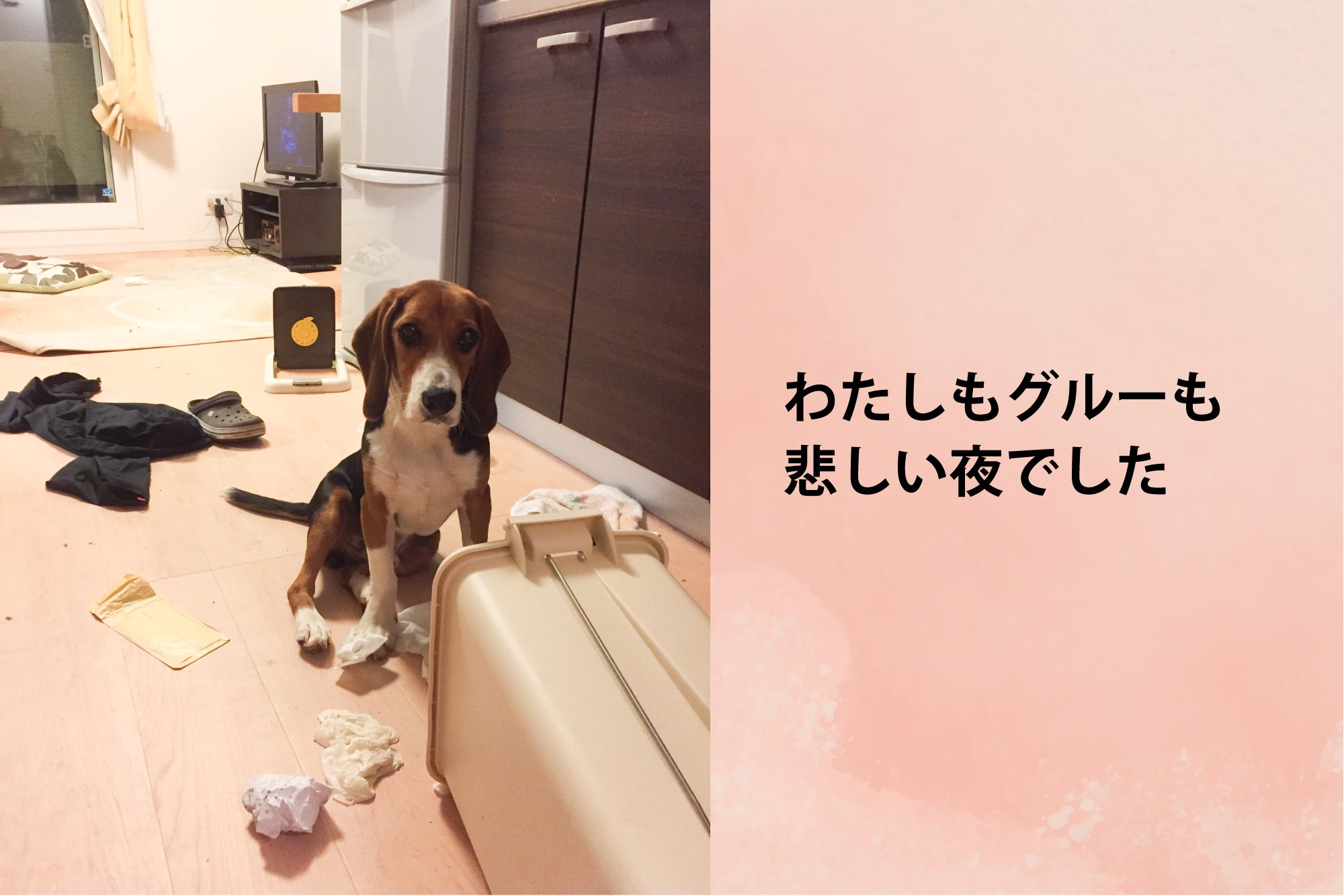 小さい頃から動物が大好きでしたが、実際に自分ひとりで犬を飼うのは初めての経験で、金銭面だけではなく、時間的にもとても大変でした。遊んであげられる時間も、朝晩のお散歩、昼食時の30分間の帰宅時だけでした。睡眠時間を削りながら心に余裕がなくなっていく日々、バイトで疲れ切って帰ってきたある夜、事件は起こりました。