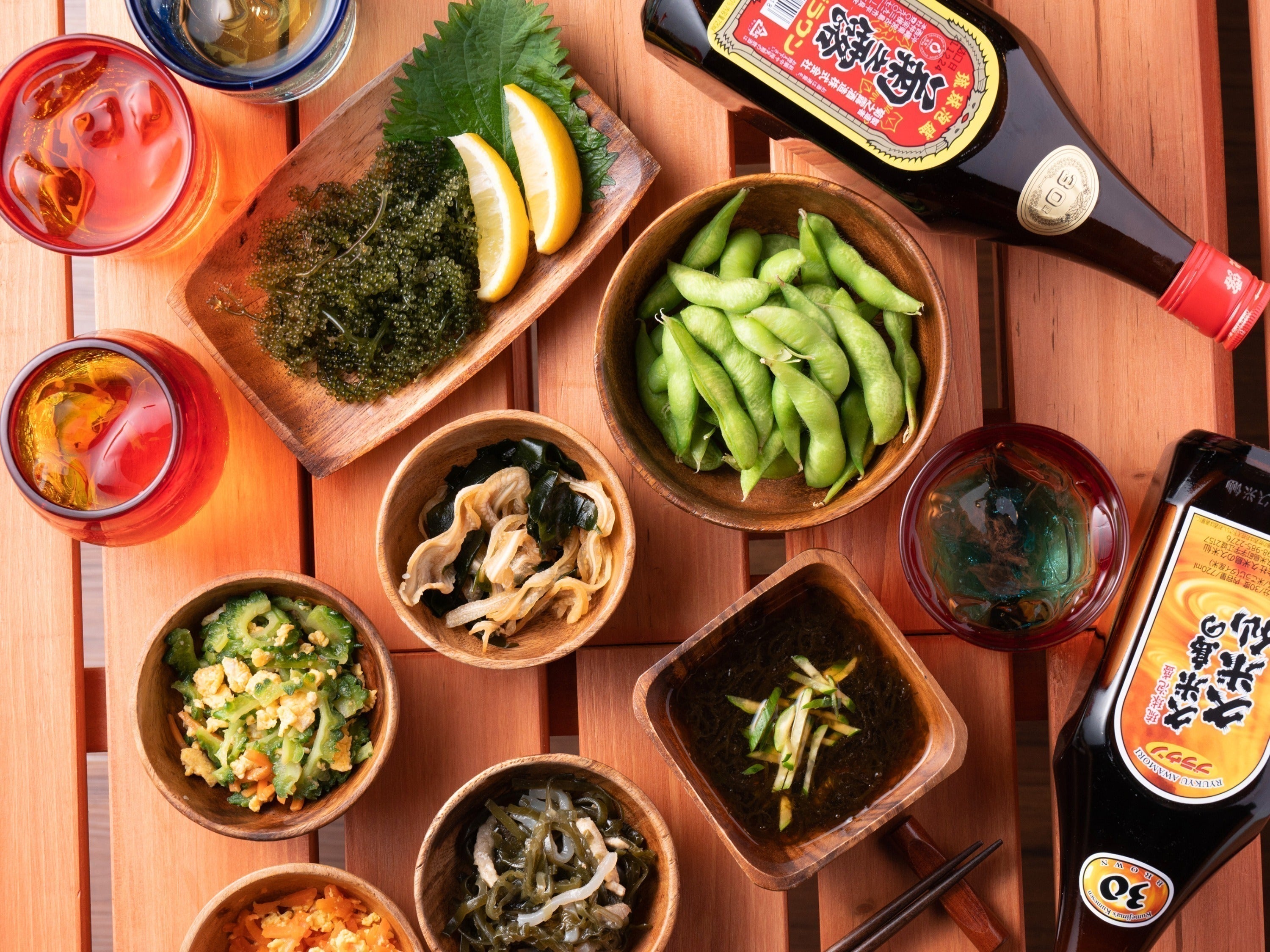 お写真をご覧いただければ、一目瞭然かと思いますが、前菜のもずく酢に始まり、島豆腐、島野菜、メインディッシュのお肉(アグー豚 or 県産和牛)、〆の沖縄そば、デザートの南国シャーベットまで、絶妙なバランスを踏まえつつ、お食事を通じて、お客様に“沖縄”を感じてもらえるように努めております。お食事だけでなく、お飲み物も、地元のオリオンビールさんやヘリオス酒造さんのアルコール類、マンゴー/パイン/シークワーサー/アセロラといった南国ジュースなど、大変こだわっております。食器やグラスも、沖縄の特産品『やちむん(焼き物)』『琉球ガラス』などを使用しています。お料理やお飲物というものは、器(うつわ)とともに楽しむものだというのが持論です。