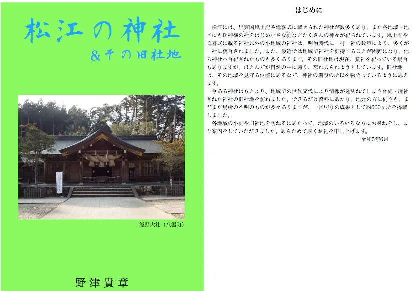 松江市内29地区の風土記時代からの神社や新しい神社、林内の小さな祠まで探し歩き、また大きな神社に合祀された社の旧社地も合わせ、約600箇所を掲載しました。