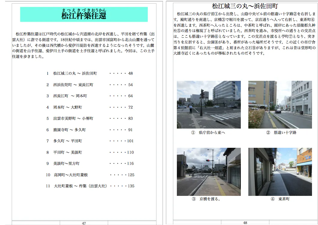 この江戸時代の往還については、1,999年の島根県の調査がありますが、それから約20前が経過し、山の中の旧道や街なかの道路の状況も変わってきています。2018年12月から美保関往還を、また2019年9月から杵築往還を歩きました。出版に向けての原稿もほぼ出来上がってきており、令和6年3月ころには出版したいと準備中です。