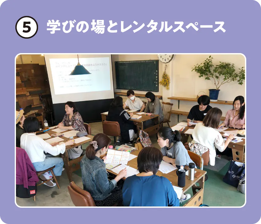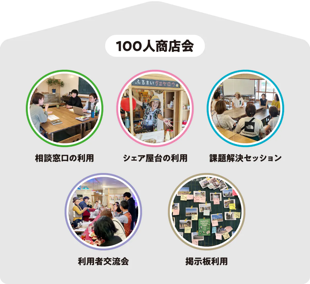 すべてのスペース利用者が会員になれて、つながりによってお互いの商いや活動を支え合う【 100人商店会 】を立ち上げます。場所をシェアする人同士が知り合い、お互いの得意分野やノウハウを共有し、チャレンジを応援しあうためのしくみです。