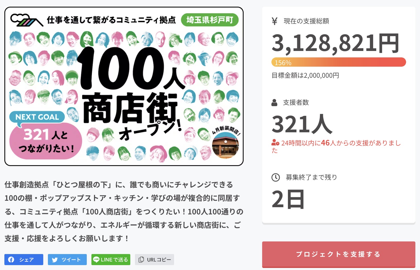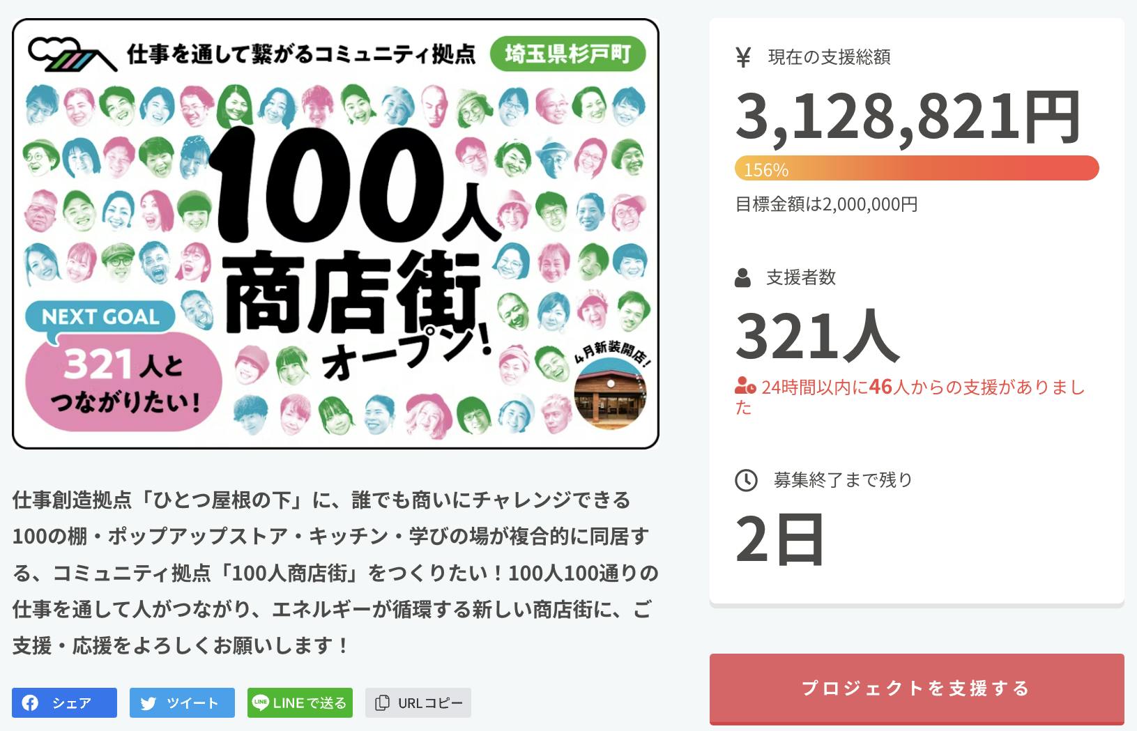 ところが、呼びかけに応答してくださる方が続々と現れ、SNSでは「あと2日!まだ間に合う!応援しよう!」と何度もシェア拡散をしてくださる方、「杉戸を盛り上げてくれてありがとう!」と逆に感謝してくださる方、度々ページにアクセスして達成度を確認してくれる家族や仲間、本当にたくさんの方があたたかく寄り添ってくださいました。