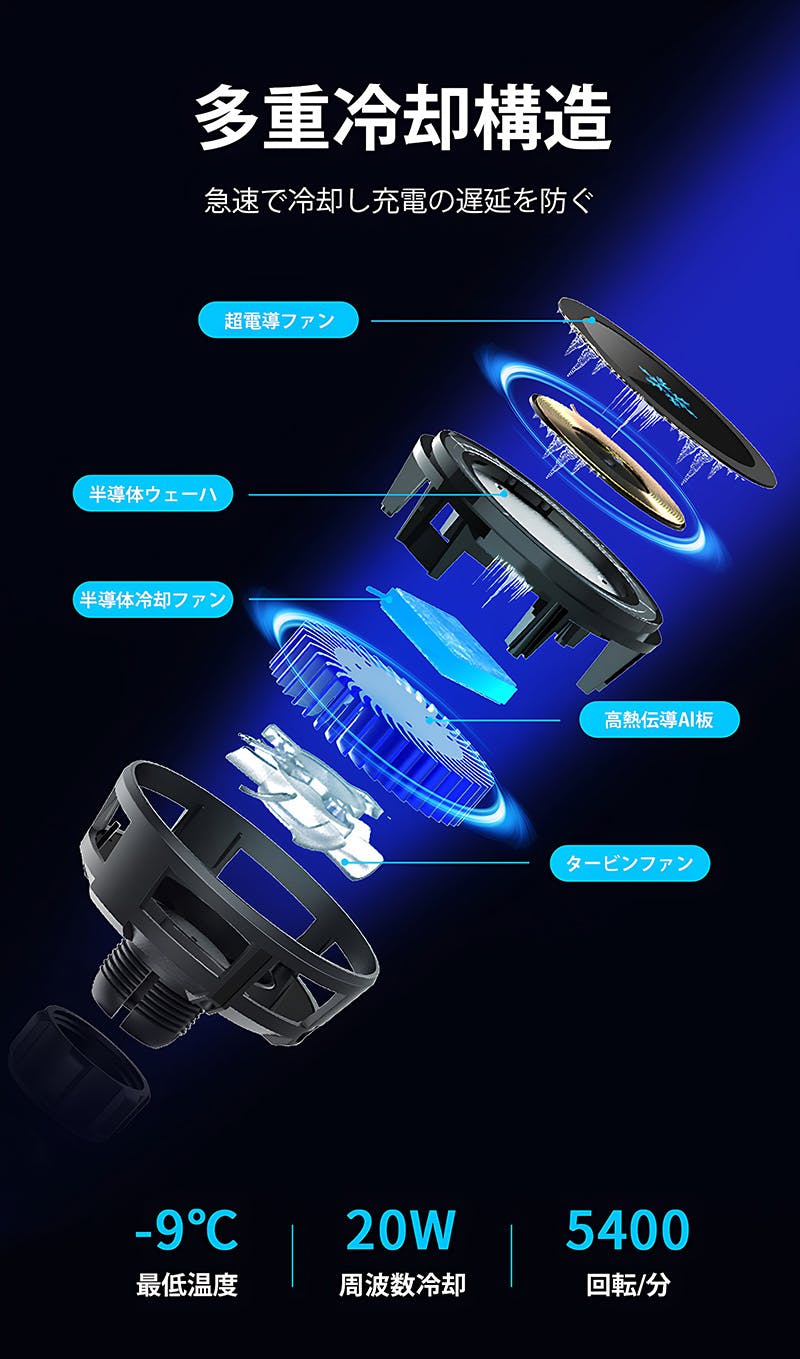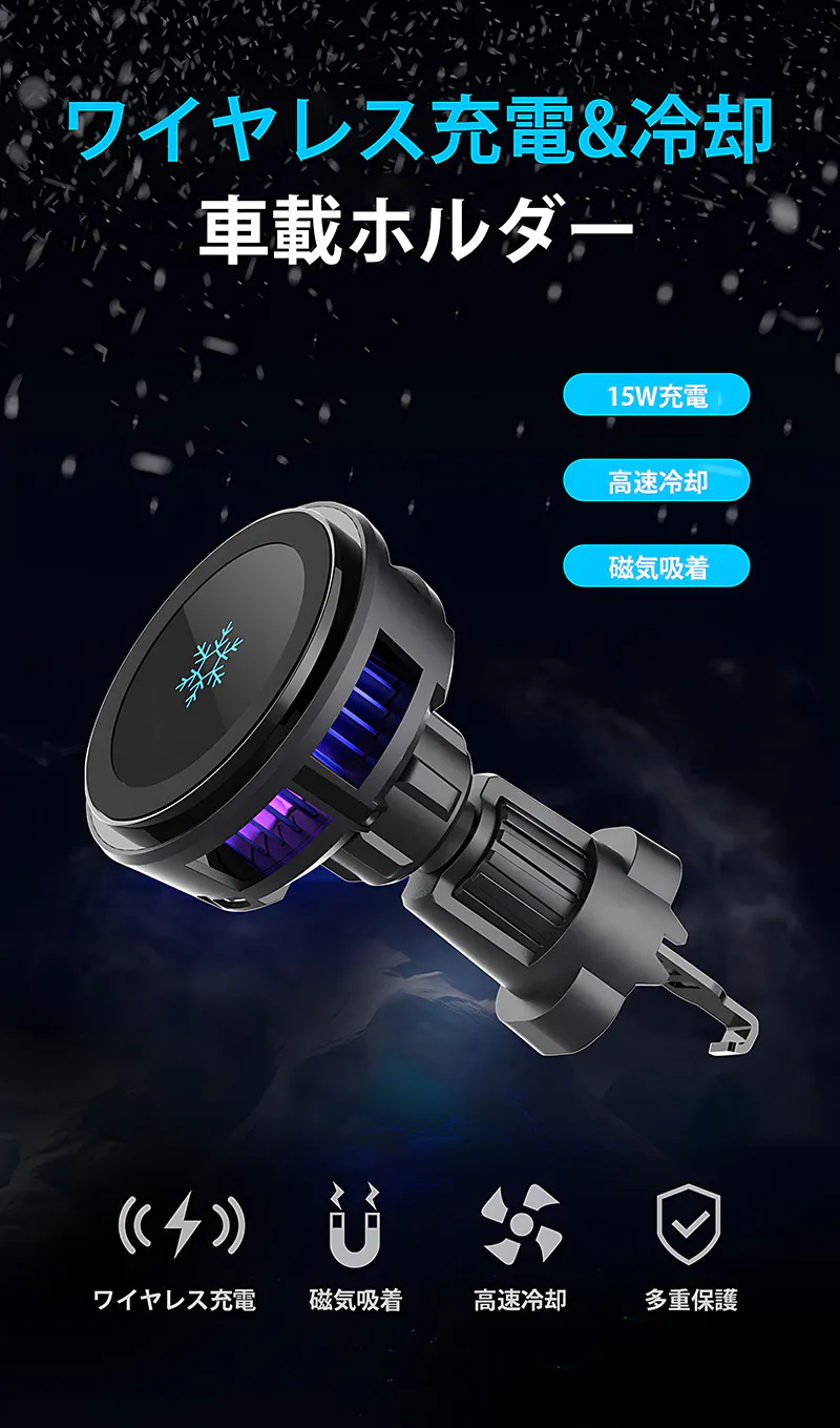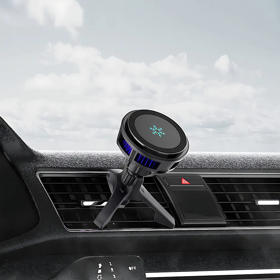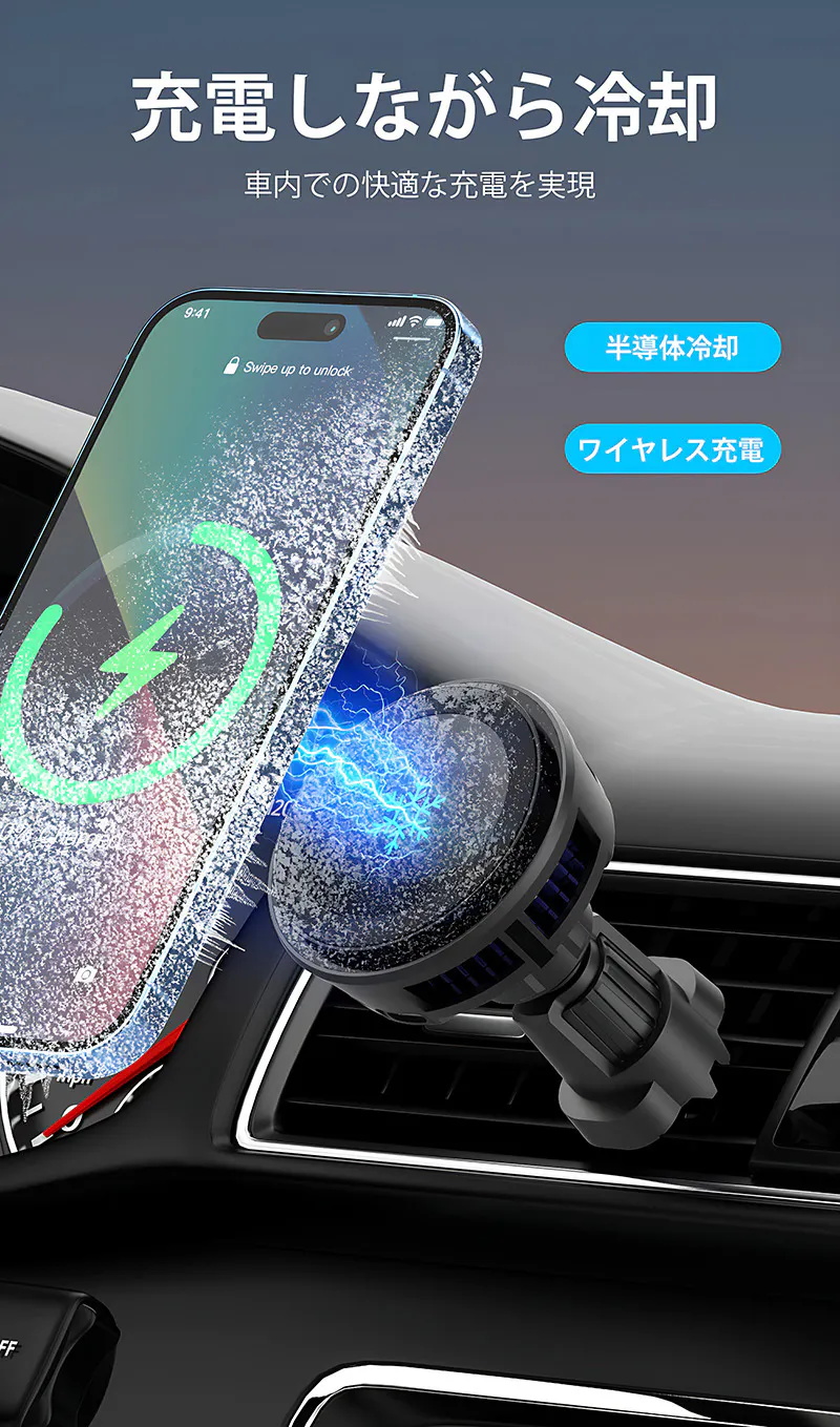 本製品はペルチェ素子クーラーを搭載し、ワイヤレス充電しながらスマホを冷却できるので、車内での充電が今まで以上に快適なものにします。