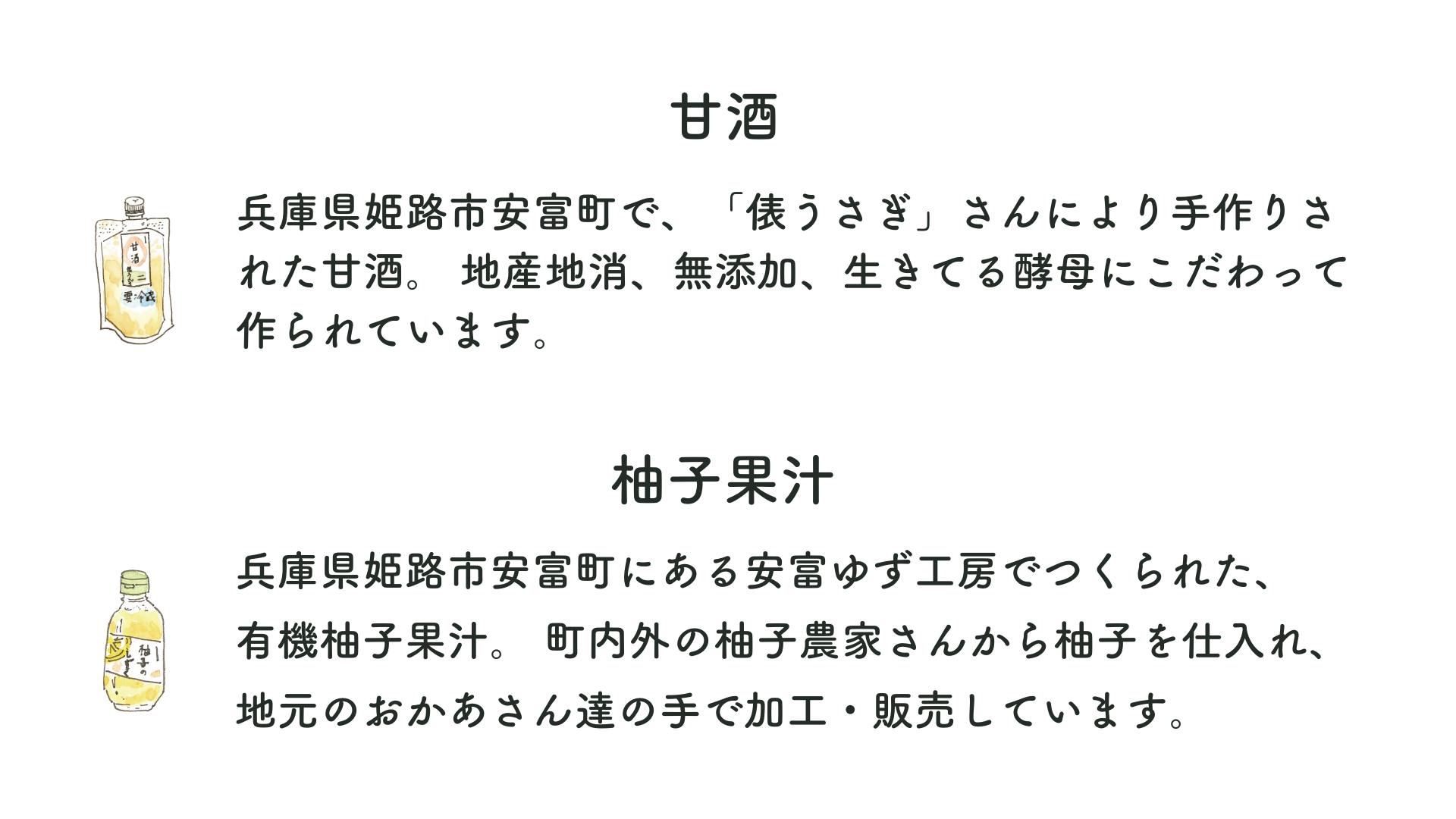 偶然にも、昨年移住した兵庫県姫路市は、柚子と、お米が特産品の地域。たくさんの方のご縁で、姫路市安富町にある安富ゆず工房さんの柚子果汁と、同じく姫路市安富町の手作り甘酒を使わせていただくことになりました。