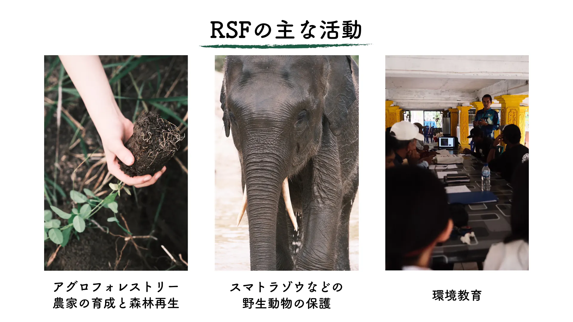 RSFは野生動物と人の共生を目指す団体です。野生ゾウの保護、植林、環境教育のほか、パーム油の農家からアグロフォレストリー農家に転向できるプログラムを農家に提供する活動をしています。