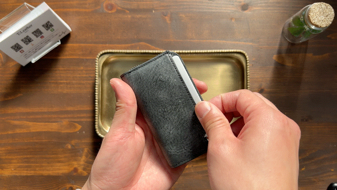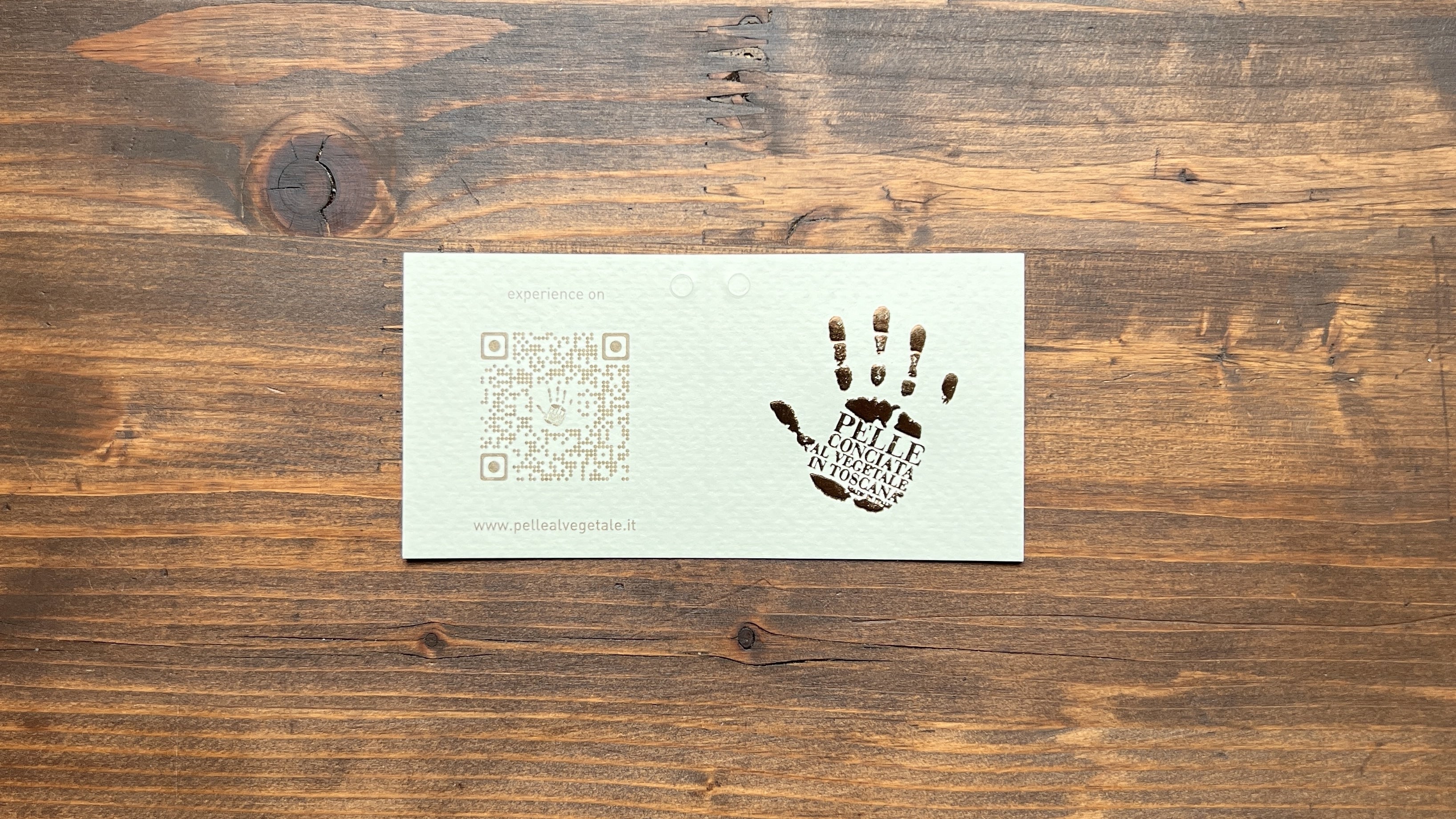 QRコードを読み取ることで、イタリアンレザーの素晴らしい世界観を体験することができます。化粧箱中央にシルバーの箔押しを施したシンプルな化粧箱に入れてお届けします。