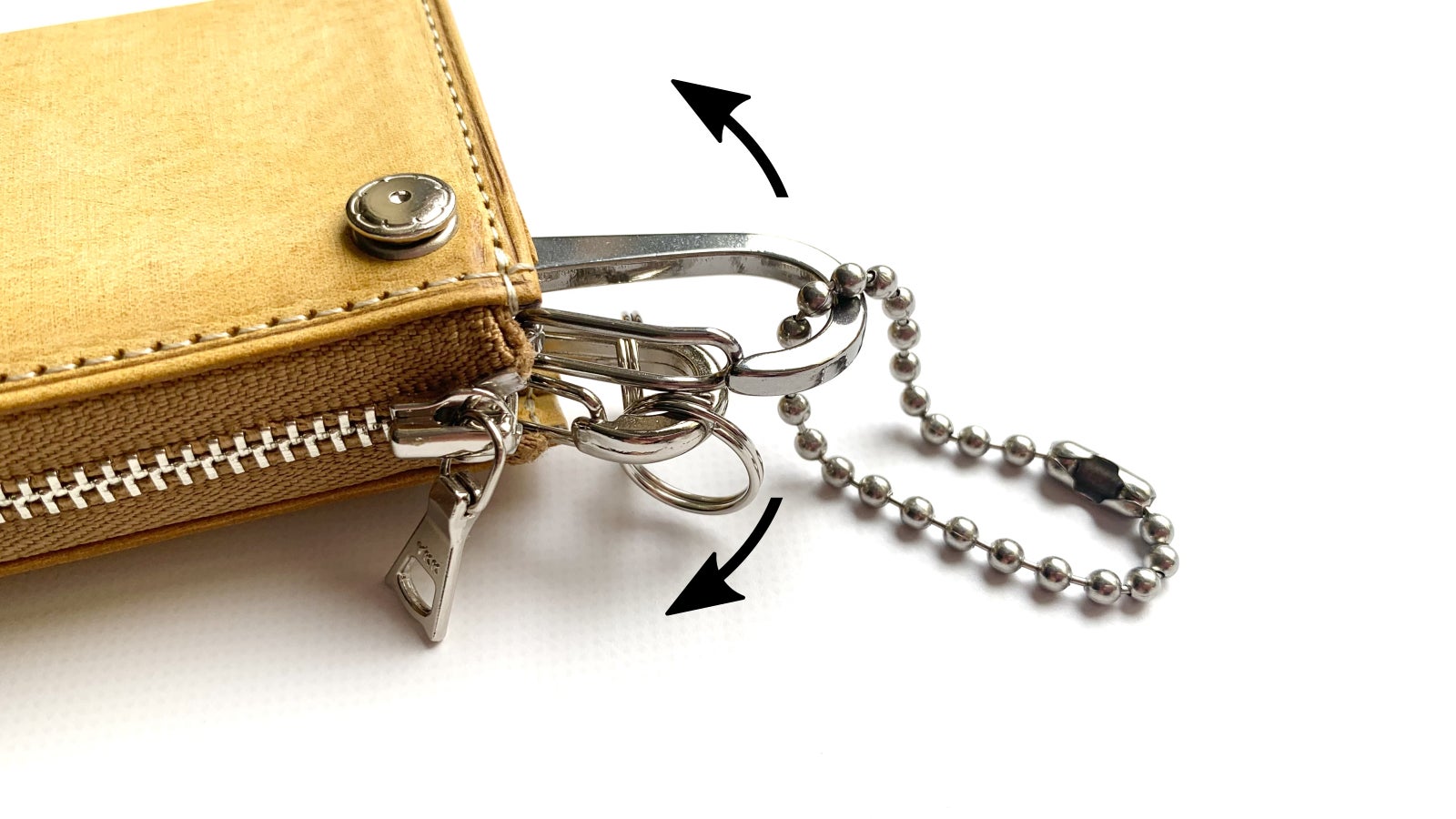 回転するカラビナにより、鍵やスマートキーをサッと取り出せます。カラビナはぞれぞれ自由に出し入れできます。