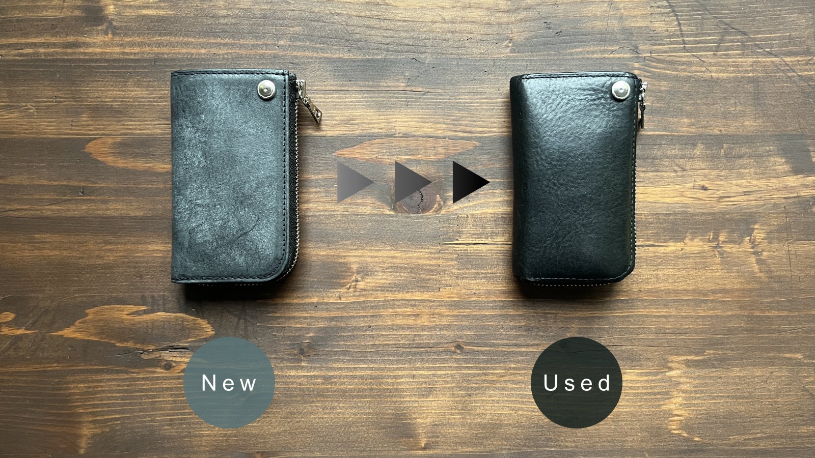 右側が半年程使用したエイジング(経年変化)サンプルです。革製品において「アジが出る」という言葉を聞いたことがある方もいると思いますが、この革の最大の特徴は美しい経年変化にあると言っても過言ではありません。