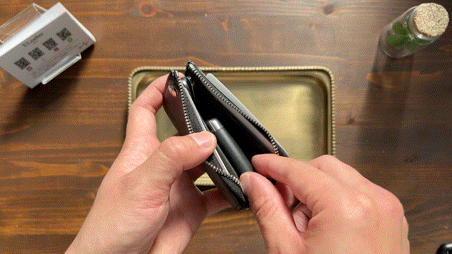 メイン収納の両脇にある仕切りの裏には、カードや折った紙幣が収納できます。
