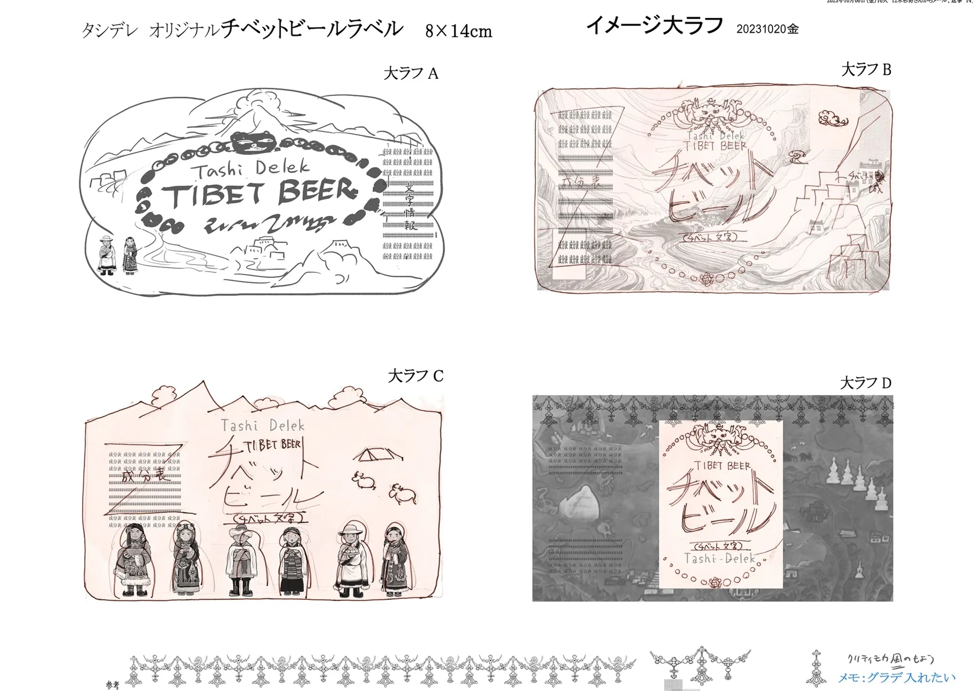 そんなビールのラベル作成に有難いことに関わらせて頂けることとなりました。タシデレの皆さんたちそれぞれが思う「チベット」のイメージをお聞きし、相談を重ねました。美味しく酔いつつチベットの大地や空や風を少しでも感じて頂けたら、と願っております。是非お手に取って下さいね。