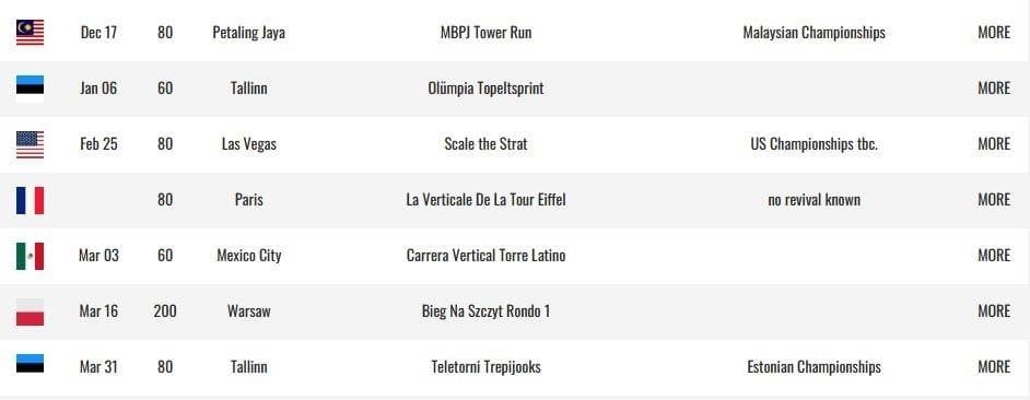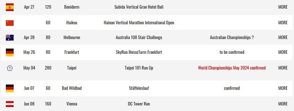 Towerrunningの2024年度の世界ツアー戦は1月から始まっていますが来月の5月から本格的にスタートします。スタートすると毎週末世界各国で開催されます。大会によって獲得できる最大ポイントが280~40と様々で選手は自分の得意な階段の長さやポイントの大きさでレースを選び、最大8レースの獲得ポイントで世界ランキングを競います。