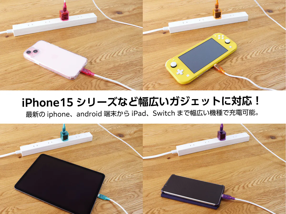 さらにUSB Power Delivery(USB PD)対応でiPhone15などのUSB PD充電に対応した機器をつなぐと最適な電力でより早く、安全に充電することができます。