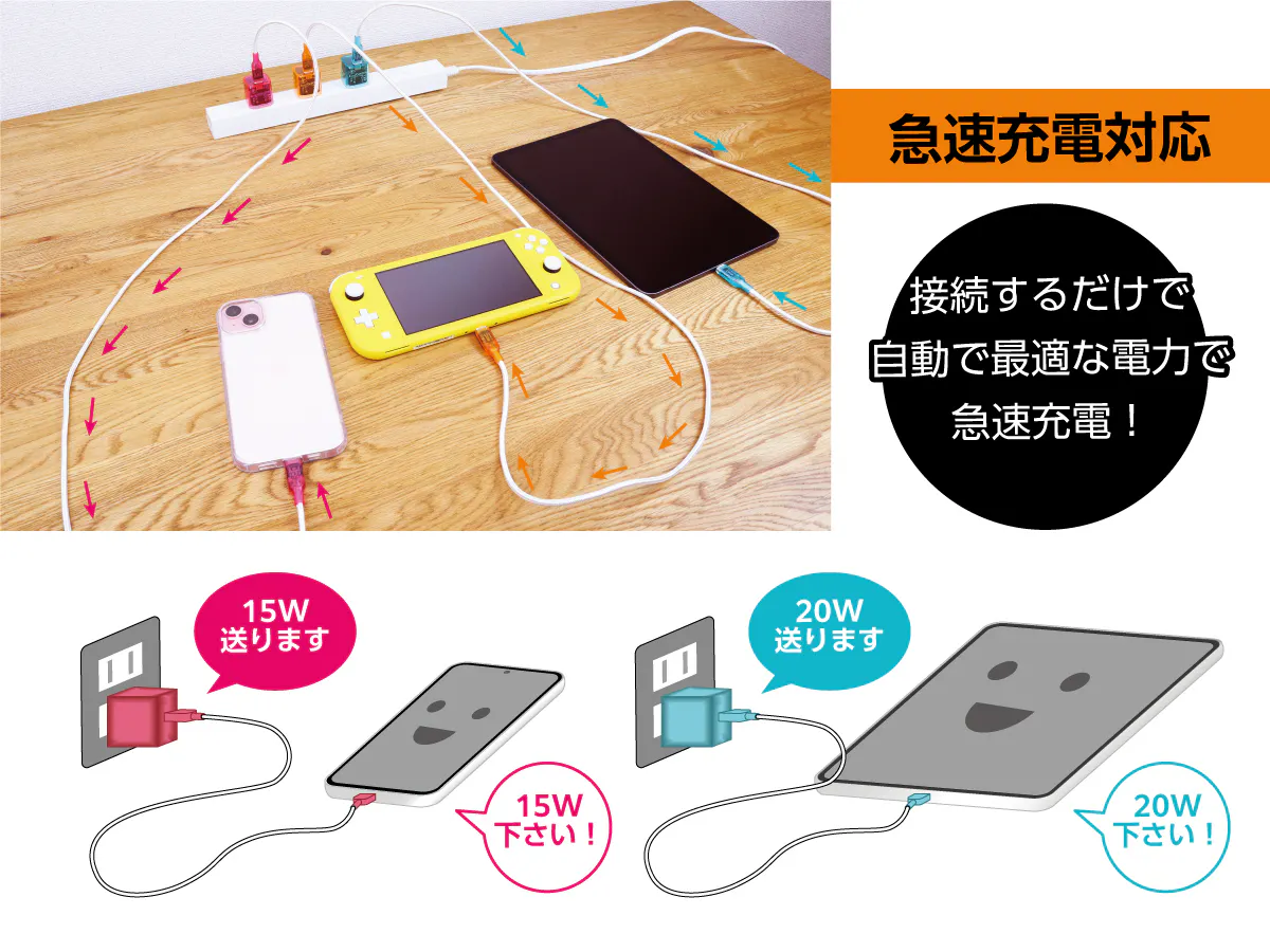 iPhone15などのUSB PD充電に対応した機器をつなぐと最適な電力でより早く、安全に充電することができます。
