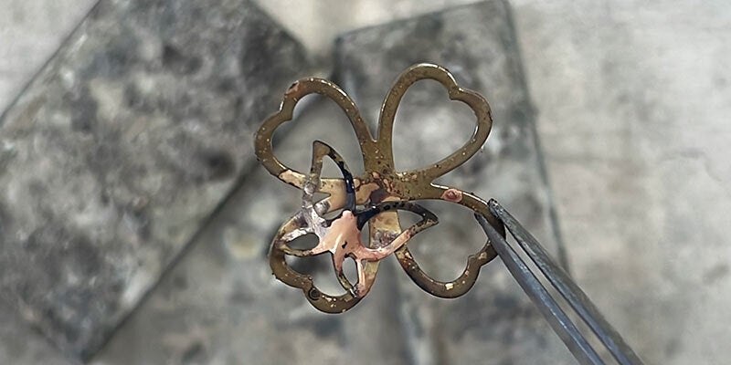 四つ葉のクローバーパーツと、蝶々のパーツをろう付けします。
