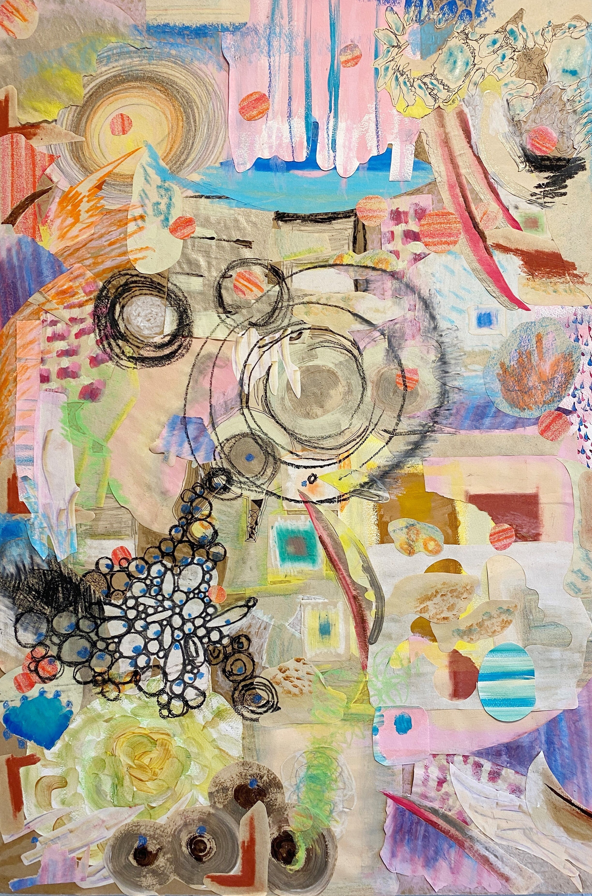 感じたままを1枚30秒程度で描く「感情のドローイング」が数百枚になった頃、絵は描けないけれど、これを張り合わせたらどうなるんだろう?という好奇心のもと、感情のドローイングを切り貼りして感情のコラージュが出来上がりました。