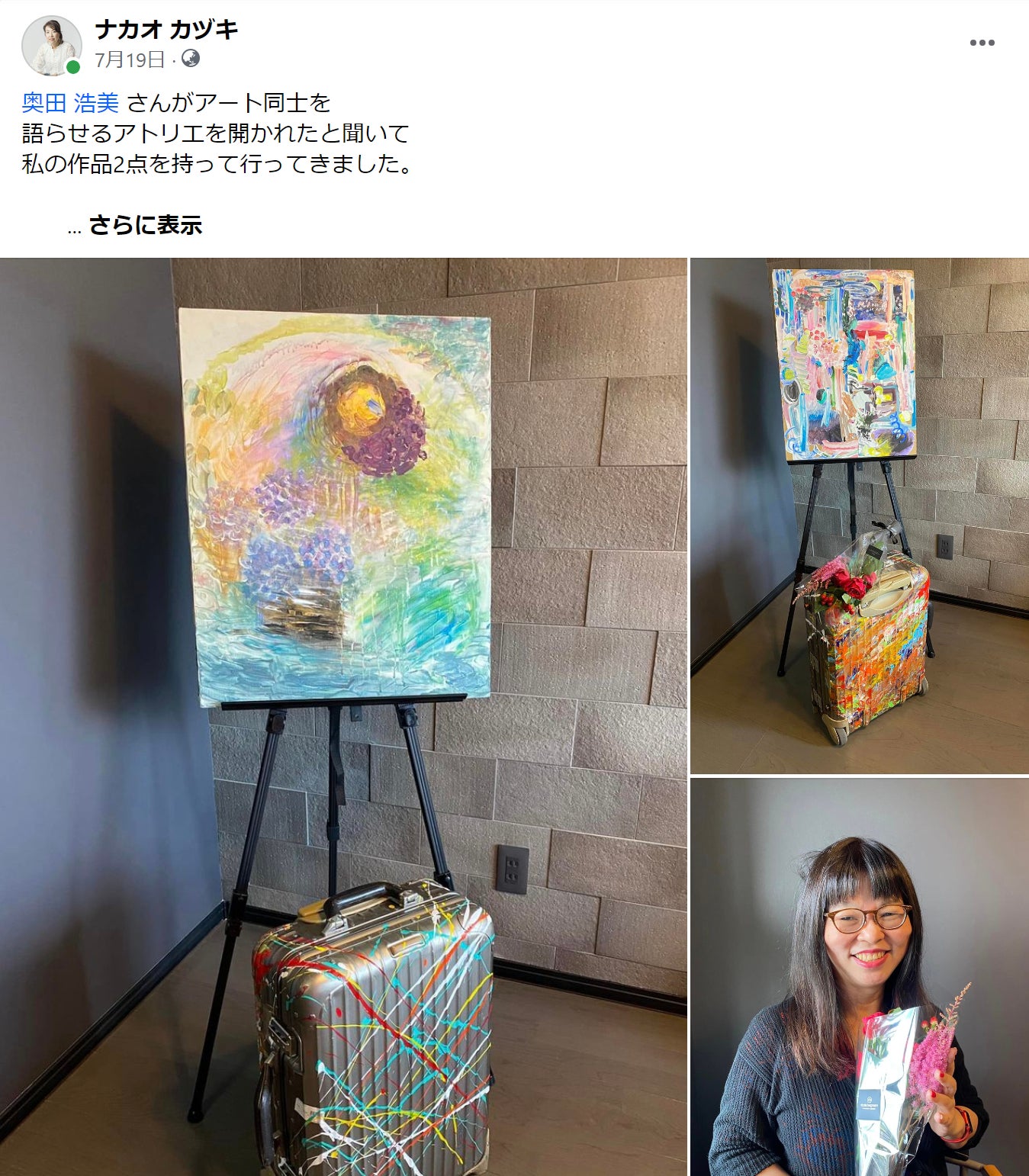 それから1か月後、奥田さんにご縁のある方たちと、これからの未来について語る合宿にアーティストとして参加することになり、奥田さんと共催でアートワークショップを開催。出会った放送作家の方に今回のNY展公募のお話をお伺いし、「STEPPING INTO A WORLD II」という公募展にはじめて応募することにしました。