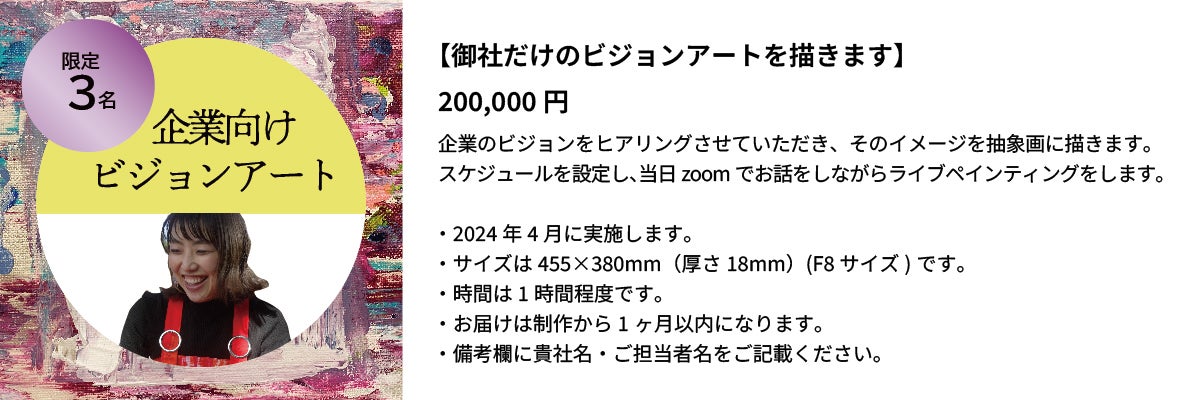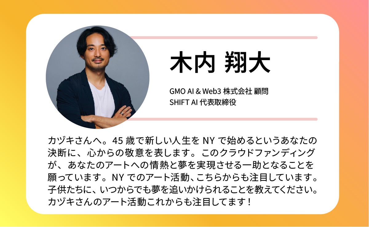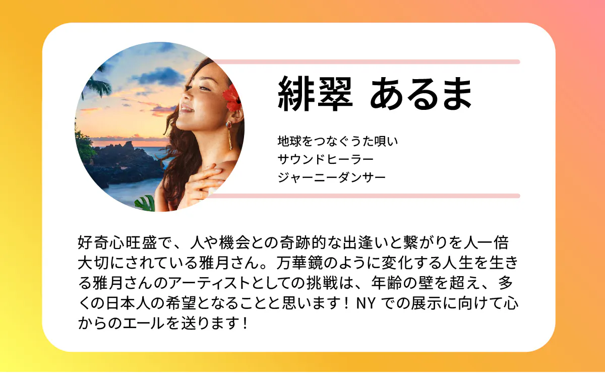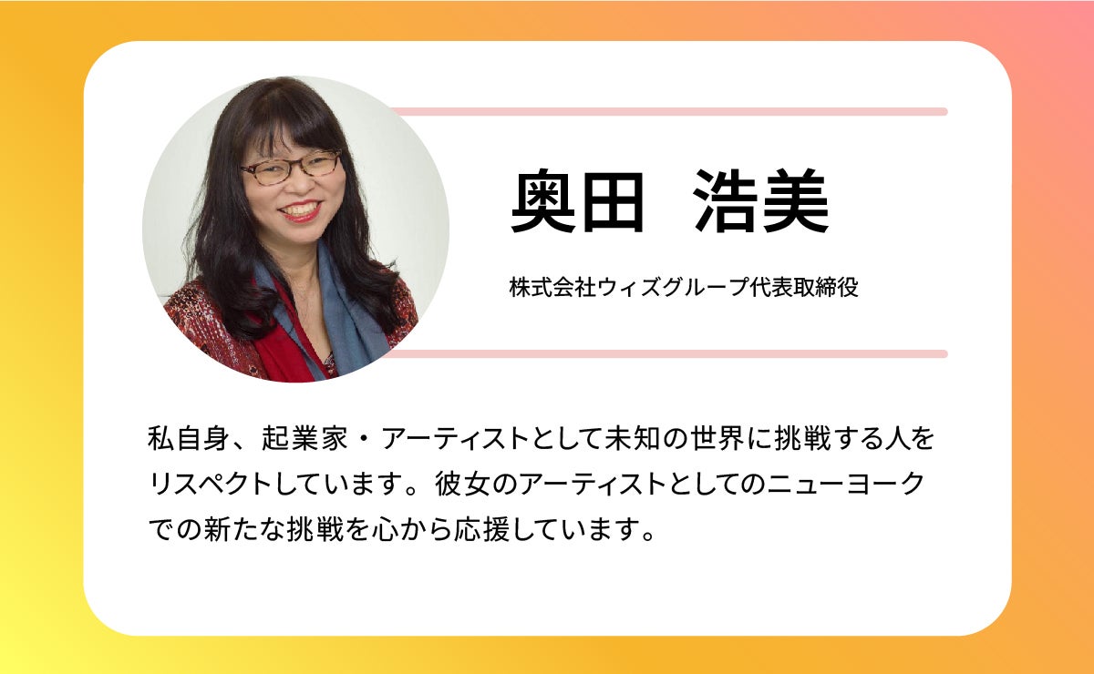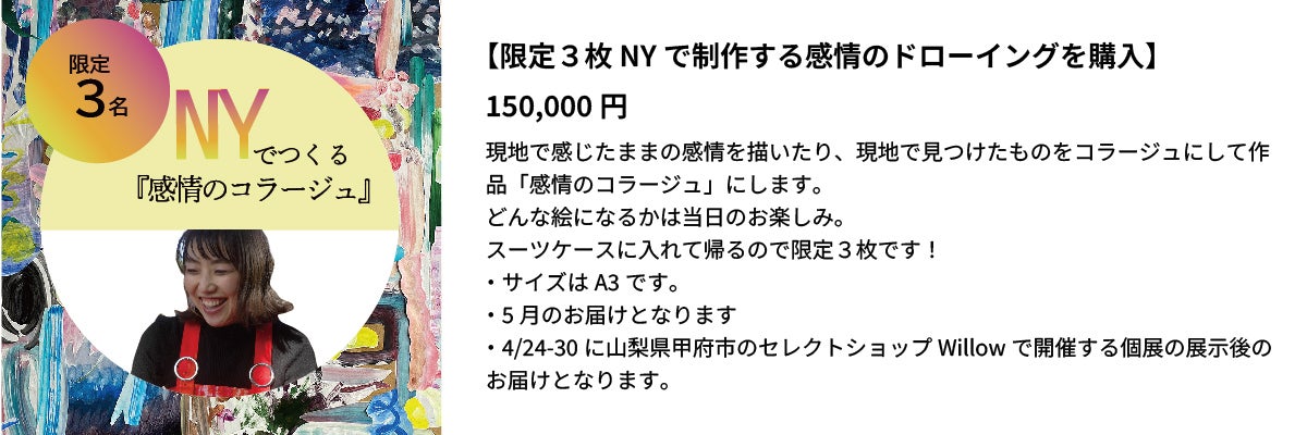 私がNYで展示する理由は、NYと日本の人をつなぐアート作品を共創するためです。NYで出会った人と共にアート制作をし、帰国後に日本でワークショップを開催することで、この旅をオンラインで感じていただくみなさんと、共に作品制作をする新しい試みにチャレンジします。なぜなら、私はアートを通して個人や企業の背中を押したいからです。