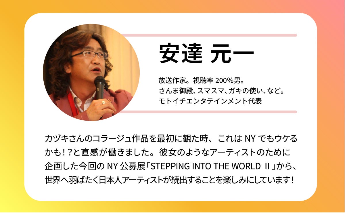 「Stepping Into A World II」展は、エミー賞放送作家の安達元一と在ニューヨークで日本文化の紹介で知られるキュレーターの佐藤恭子が手を組んだ展覧会シリーズの第5弾で、公募して審査を通過したアーティストの作品を展示します。