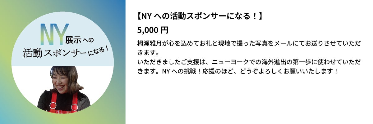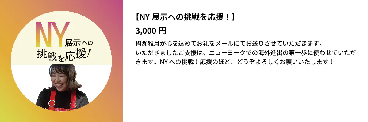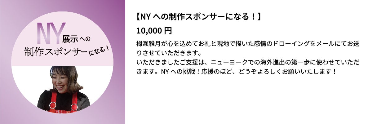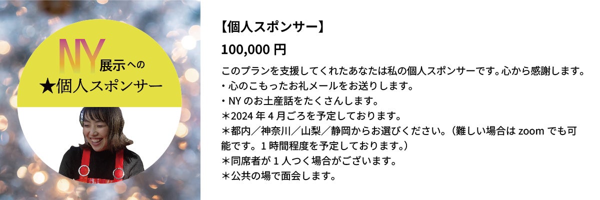 今回皆さまからいただいた資金は、NYへ旅する際の「交通宿泊費」や「制作費」「展示費用」の一部に充てさせていただきます。
