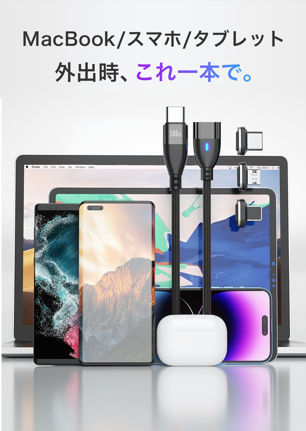 マグネット端子をデバイス本体に装着しておくことで、吸着充電。これ1本であらゆるデバイスを充電可能。ケーブルを区別して挿し込む手間がありません。