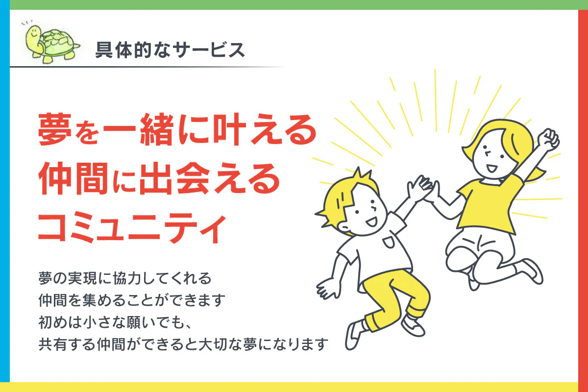 夢を叶える仲間と出会えるコミュニティです。お子さんの夢を実現する体験を学生や親以外の大人とつくります。