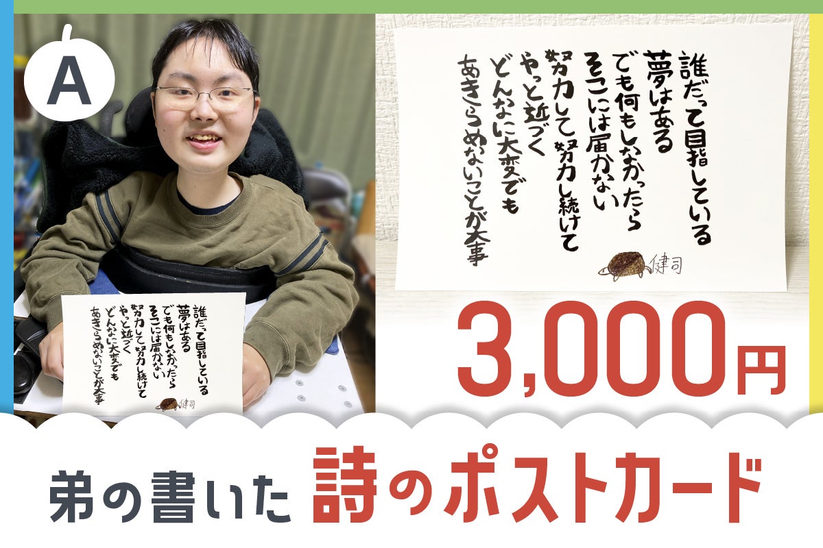自分の手で書いた、弟の思いが伝わってくる1枚です。弟が書いたカメの絵も入れました。こちらのポストカードはどの商品にも一枚入っています。手にとって読んで頂けると嬉しいです。