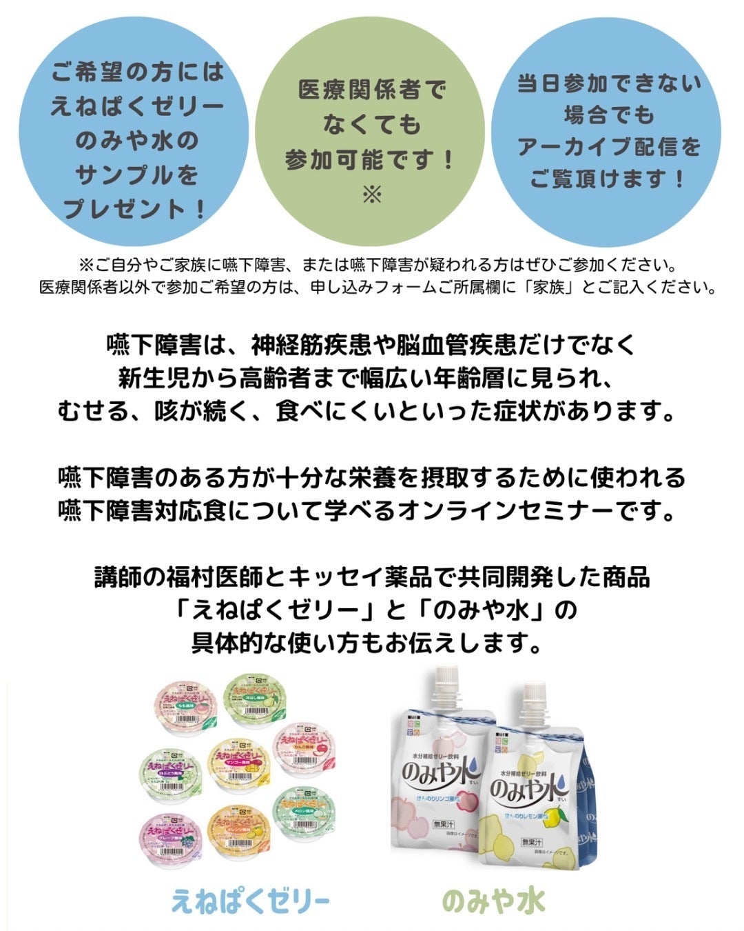 今回は福村先生とキッセイ薬品工業株式会社で 共同開発した商品「えねぱくゼリー」と「のみや水」の具体的な使い方もお伝えします。
