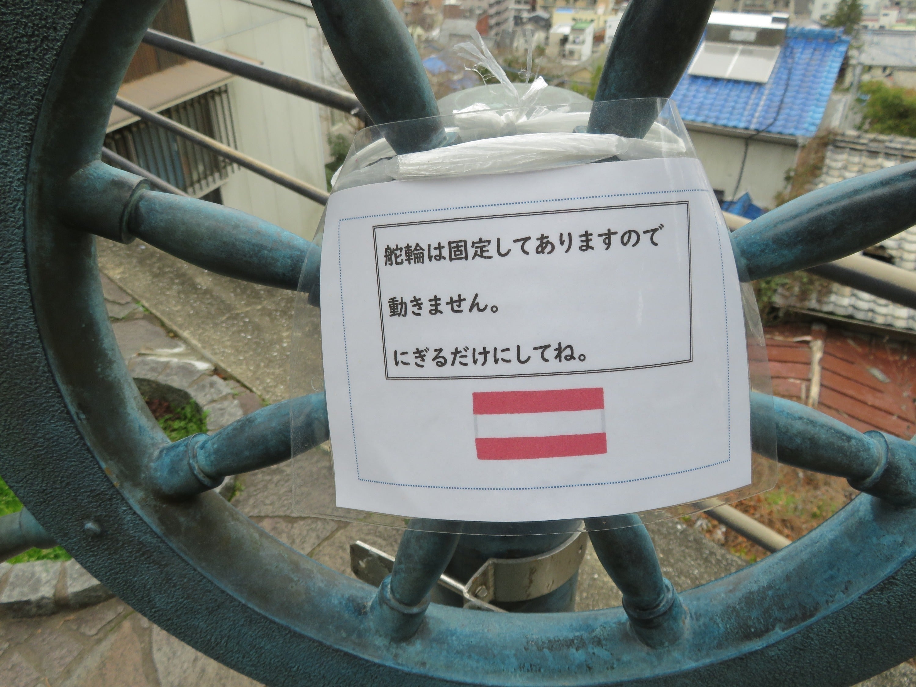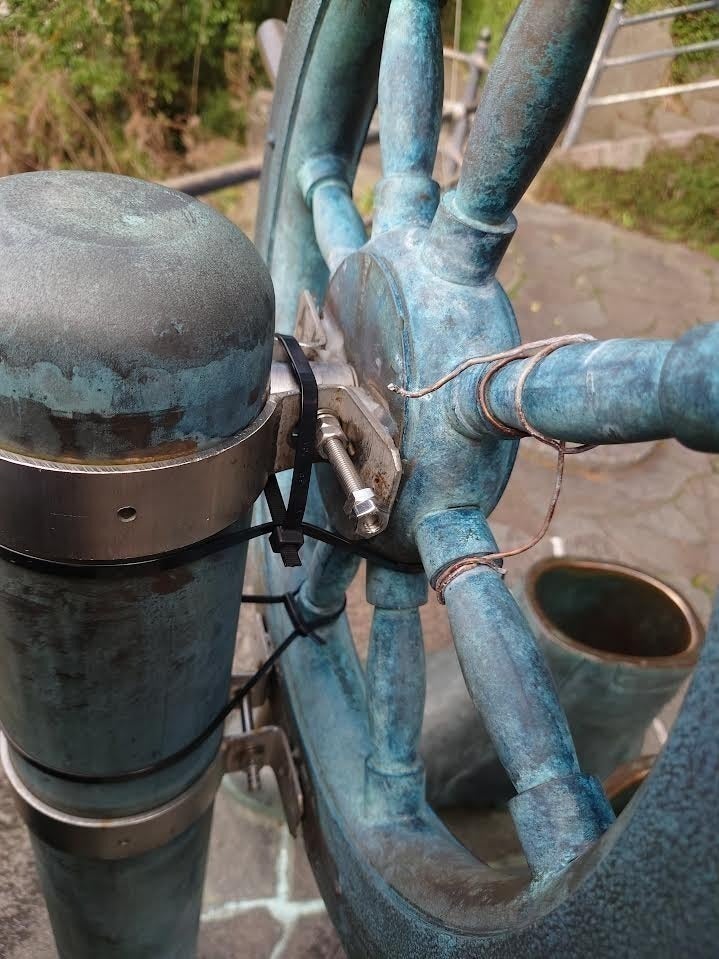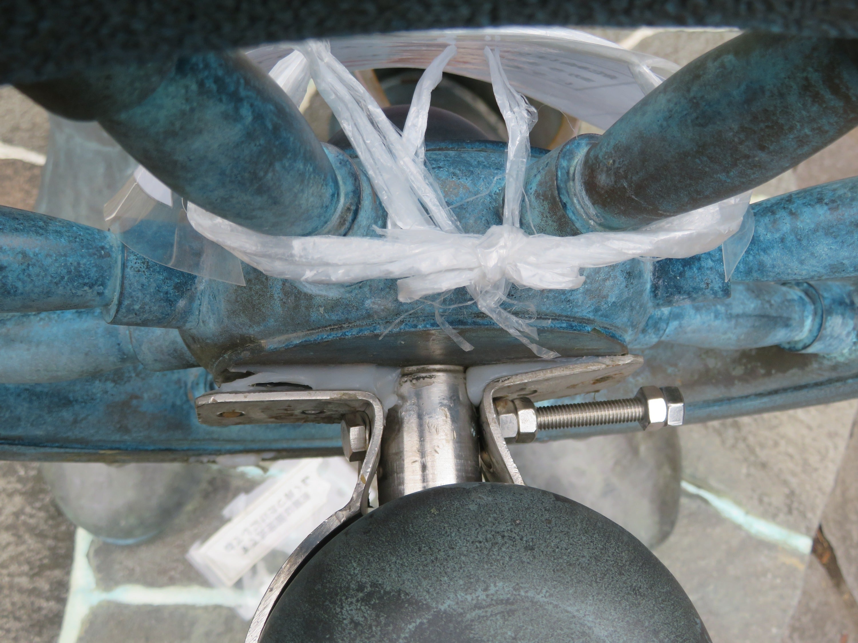 『龍馬のぶーつ像』は、平成7年(1995)10月建立以来約30年になりますが、本来固定式の舵と支柱の接続部分が外れ、中心のステンレスの芯棒により落下の危険性は無いものの、保安・保全のための修理が必要な状態にあります。舵と支柱はブロンズ製の鋳物である為、製造元の専門業者(富山県内の鋳物専門業者)に完全修復(費用約70万円)を依頼したいと考えています。