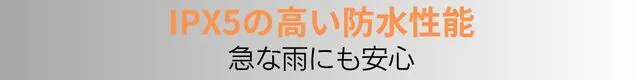 雨の日や冬の雪の降る日、水辺などでも気にせず使用できるIPX5の防水性能。