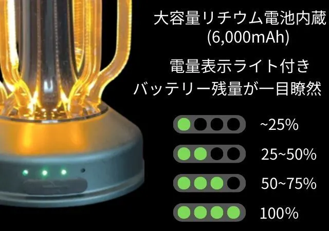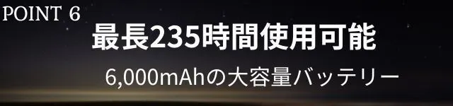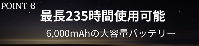 6,000mAhの大容量バッテリーを搭載。3.5時間のフル充電で最長235時間(9.5日)使用可能(弱いモード時)。停電や災害時にも役立ちます。