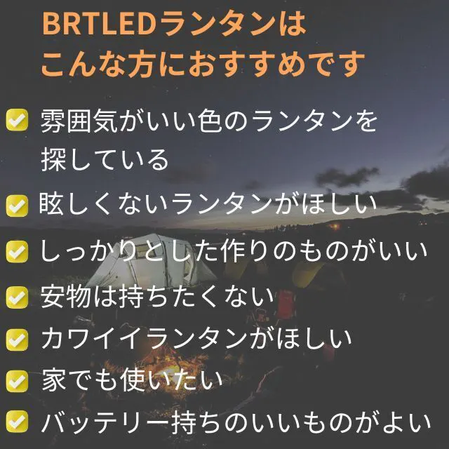 私たちは、この素晴らしい製品を多くの日本の皆様に知っていただき、より豊かなアウトドアライフやおうち時間を楽しんで頂きたいという想いから輸入販売を開始することを決意しました。BRTLEDランタンは、皆様の夜時間のパートナーとして、大切な人、大切なものと快適な時間を過ごすお手伝いをすることでしょう。私たちは、このランタンが日本の夜時間の楽しみ方に新しい風を吹き込むことを心より願っております。