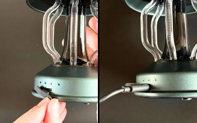 充電中は緑色のランプが点滅します。充電完了すると4つのランプすべてが点灯状態になります。
