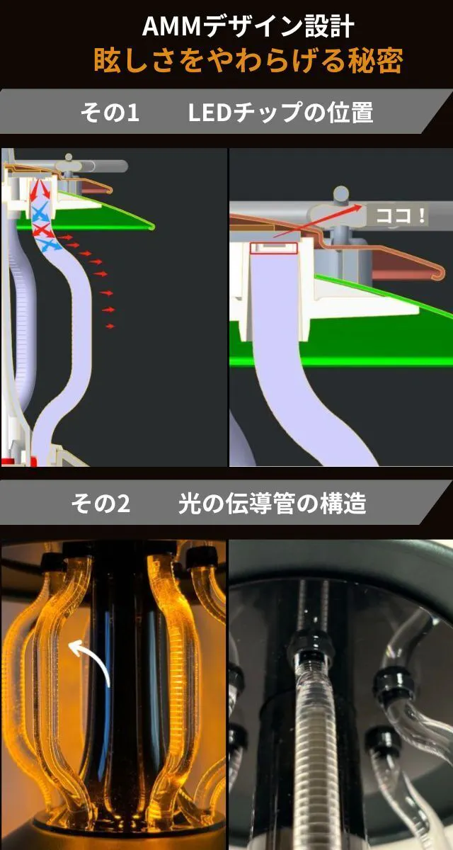LEDチップが天井部分に収納されており、光源が直接目に入ってこない構造。また光を伝える伝導管(ライトガイド)は、オリジナルのカーブ構造により光をかたよりなく伝えるデザイン。