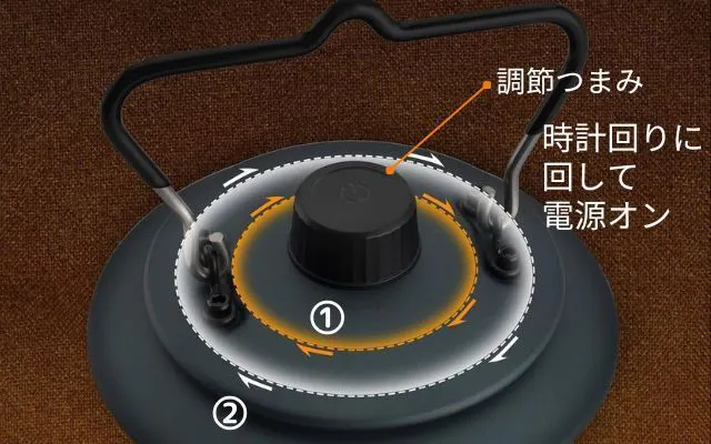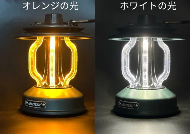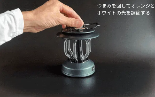 BRTLEDランタンは、「光の色」を調節することが可能です。ツマミを回してスイッチを入れるとまずオレンジの光が点灯、さらに回すとホワイトの光が点灯します。