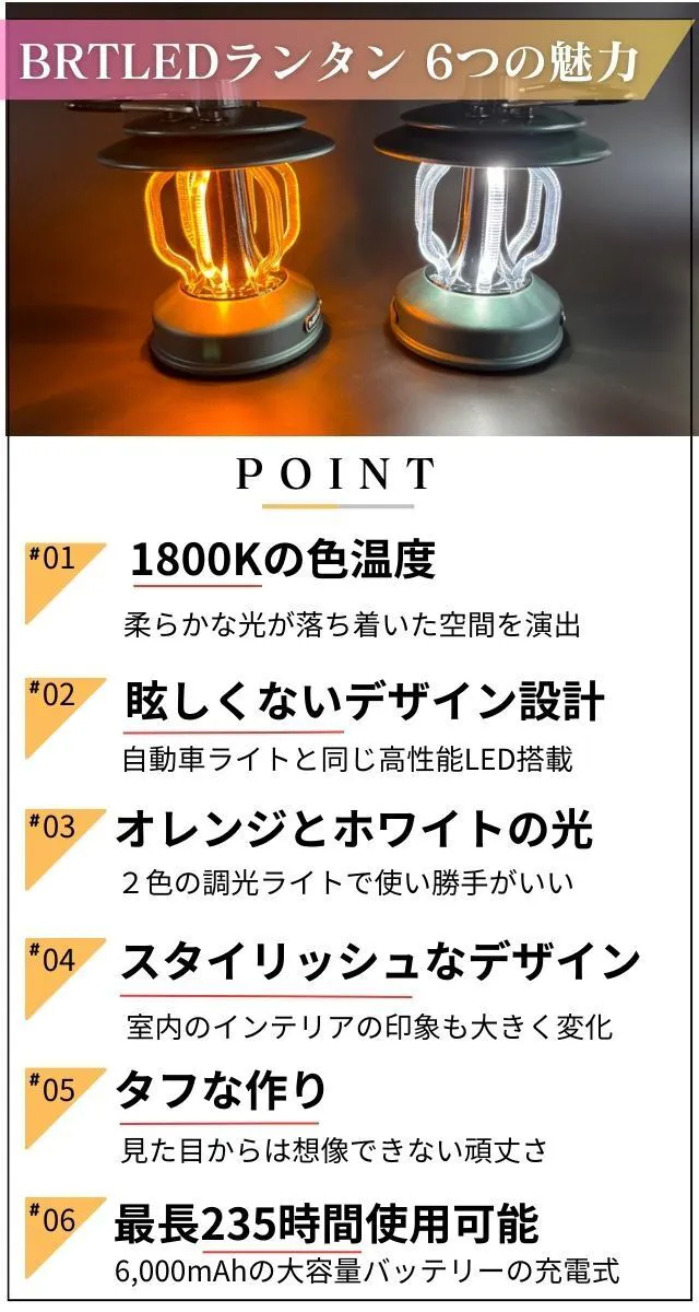 一般的なランタンが雰囲気がいいとされているもので、2700~3000K(ケルビン)の電球色が多い中、『BRTLEDランタン』は小型ながら高性能LEDチップを6個搭載したなんとも言えないオレンジの光が広がります。